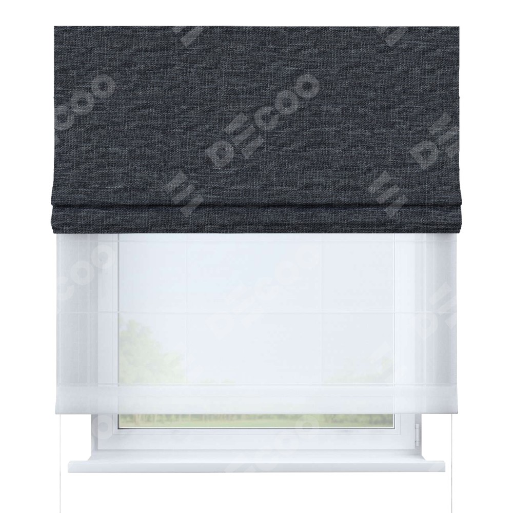 Двойная римская штора «День-ночь» от производителя Cortin предназначена для использования в проёмах. Эта штора уникальна тем, что состоит из двух полотен. На лицевой стороне находится рогожка димаут графит (артикул: 90950), обеспечивающий эффективное затемнение. В комплект также входит вторая ткань — легкий белый тюль (артикул: V-01), который добавляет изящества и легкости оформлению окна. Кроме того, доступны и другие разновидности ткани тюль, выбор которых доступен по  ссылке .