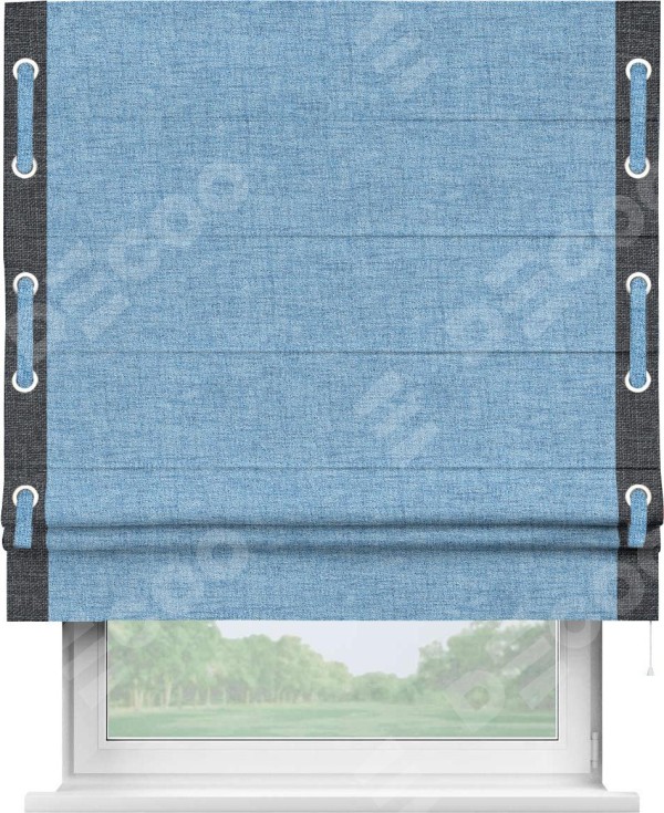 Римская штора пошита из ткани рогожка димаут голубой, артикул: 91025, с отделкой кантом «Стрим Дуо», дополненная декоративными люверсами на этих кантах и протянутым пояском из основного цвета римской шторы, представляет собой высоко декоративное и функциональное решение для оконного оформления. Канты, расположенные по обеим боковым сторонам шторы, уже добавляют изысканности и завершенности внешнему виду. Добавление люверсов и пояска не только усиливает декоративный эффект, но и придает шторе дополнительную текстурность и глубину.