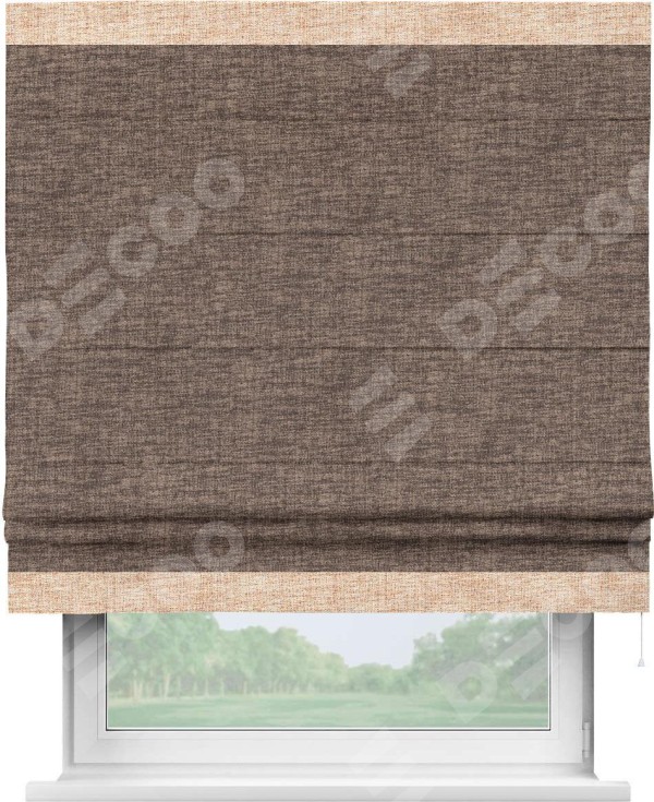 Римская штора пошита из ткани рогожка димаут коричневый, артикул: 91018, с отделкой кантом «Горизонт» предлагает уникальное дизайнерское решение, при котором кант располагается только вверху и снизу шторы. Такое решение делает акцент на горизонтальных линиях, визуально расширяя пространство и придавая окну более строгий и организованный вид. Отделка кантом в этих ключевых местах не только украшает штору, но и способствует её долговечности, защищая наиболее уязвимые к износу края.