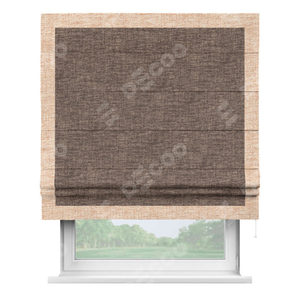 Римская штора пошита из ткани рогожка димаут коричневый, артикул: 91018, с отделкой кантом «Чесс» отличается своей уникальной деталью — наличием канта не только по бокам и снизу, но и сверху по всем краям шторы. Это придает шторе особенно аккуратный и завершенный вид, делая акцент на границах и форме шторы. Отделка кантом по всему периметру шторы усиливает её декоративные качества и подчеркивает строгую геометрию, что может быть особенно актуально для современных и минималистичных интерьеров.