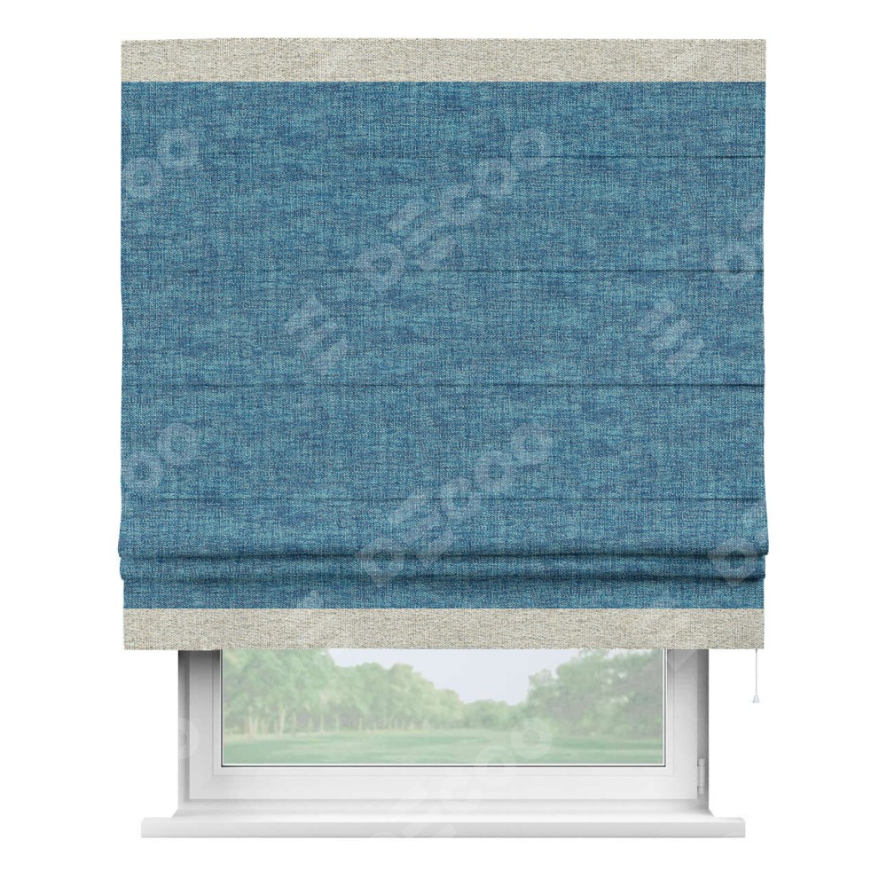 Римская штора пошита из ткани рогожка димаут лазурно-синий, артикул: 91024, с отделкой кантом «Горизонт» предлагает уникальное дизайнерское решение, при котором кант располагается только вверху и снизу шторы. Такое решение делает акцент на горизонтальных линиях, визуально расширяя пространство и придавая окну более строгий и организованный вид. Отделка кантом в этих ключевых местах не только украшает штору, но и способствует её долговечности, защищая наиболее уязвимые к износу края.