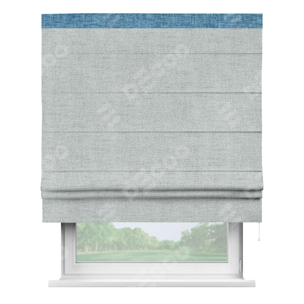 Римская штора пошита из ткани рогожка димаут серый, артикул: 91027, с отделкой кантом «Кинг» отличается своей необычной особенностью: кант располагается исключительно сверху шторы. Такой дизайн делает акцент на верхней части окна, визуально поднимая потолок и придавая интерьеру более возвышенный и изысканный вид. Отделка кантом на верхней кромке не только украшает штору, но и может служить дополнительной защитой от износа в месте наибольшего контакта с механизмом управления шторой.