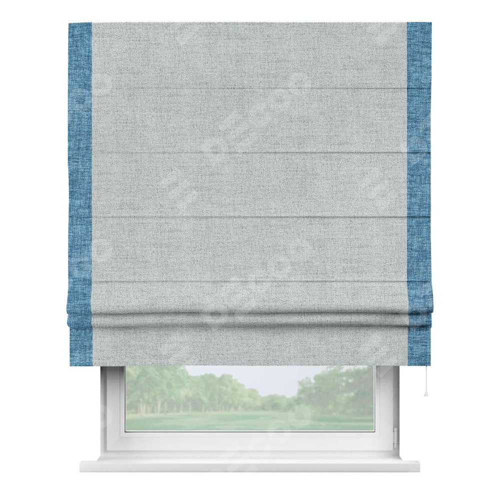 Римская штора пошита из ткани рогожка димаут серый, артикул: 91027, с отделкой кантом «Стрим Дуо» выделяется наличием кантов по обоим бокам шторы, слева и справа. Этот дизайн придает шторе аккуратный и завершенный вид, акцентируя вертикальные линии и визуально вытягивая окно в высоту. Отделка кантом по бокам не только украшает штору, но и служит практической функцией, укрепляя края и продлевая срок службы изделия.