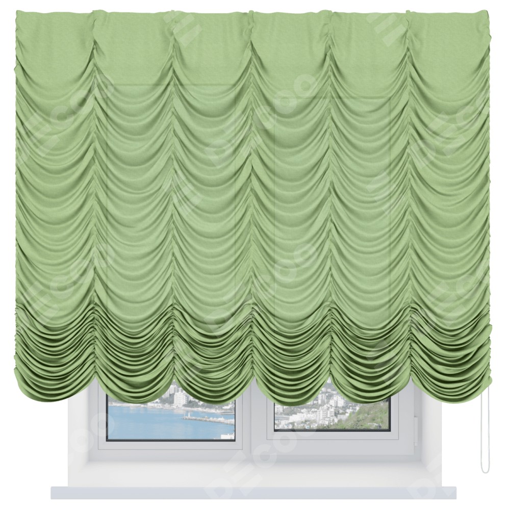 Французская штора производителя «Cortin», используется для проёма, пошита из ткани лён зелёный, артикул ткани 85906. Имеет универсальный механизм и подходит для монтажа: на потолок и на стену.
