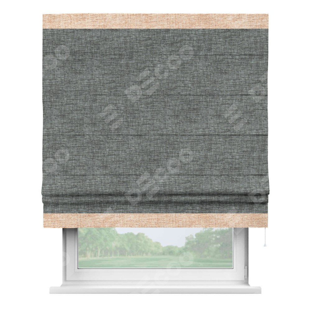 Римская штора пошита из ткани рогожка димаут тёмно-серый, артикул: 91029, с отделкой кантом «Горизонт» предлагает уникальное дизайнерское решение, при котором кант располагается только вверху и снизу шторы. Такое решение делает акцент на горизонтальных линиях, визуально расширяя пространство и придавая окну более строгий и организованный вид. Отделка кантом в этих ключевых местах не только украшает штору, но и способствует её долговечности, защищая наиболее уязвимые к износу края.