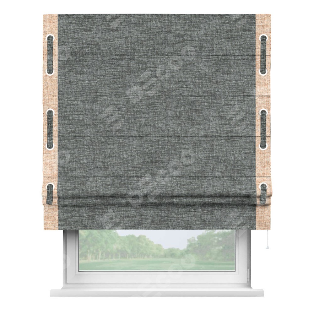 Римская штора «Кортин» для проёма, рогожка димаут тёмно-серый, с кантом Стрим Дуо (люверсы с пояском)