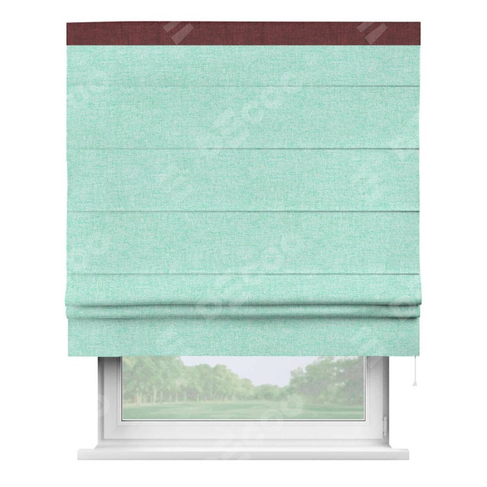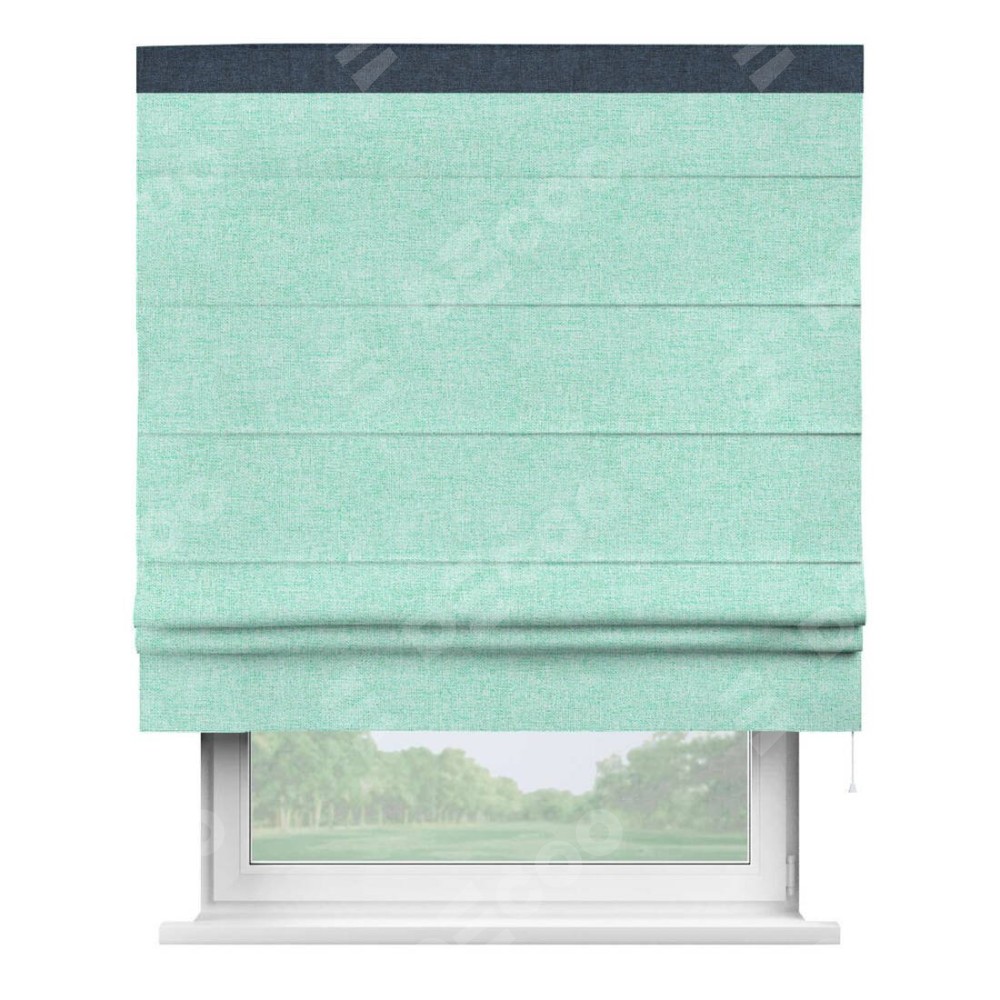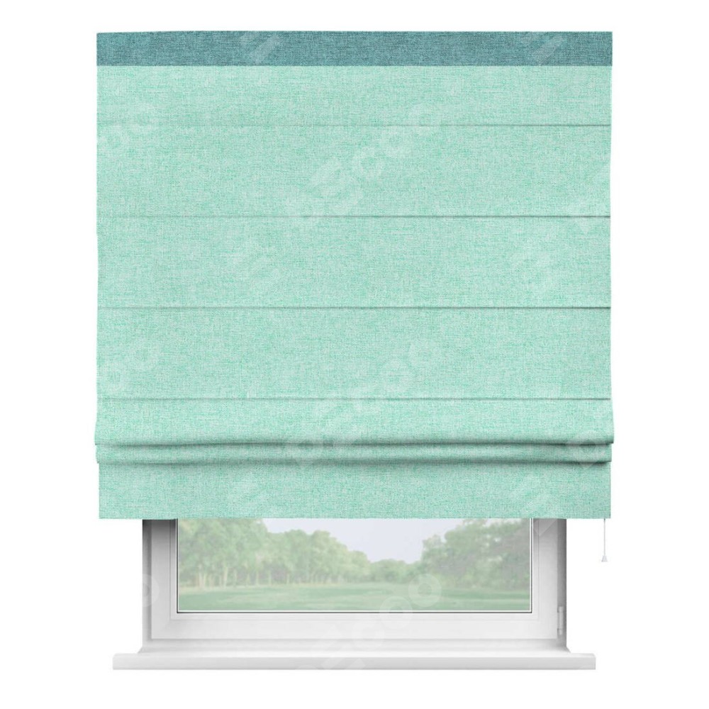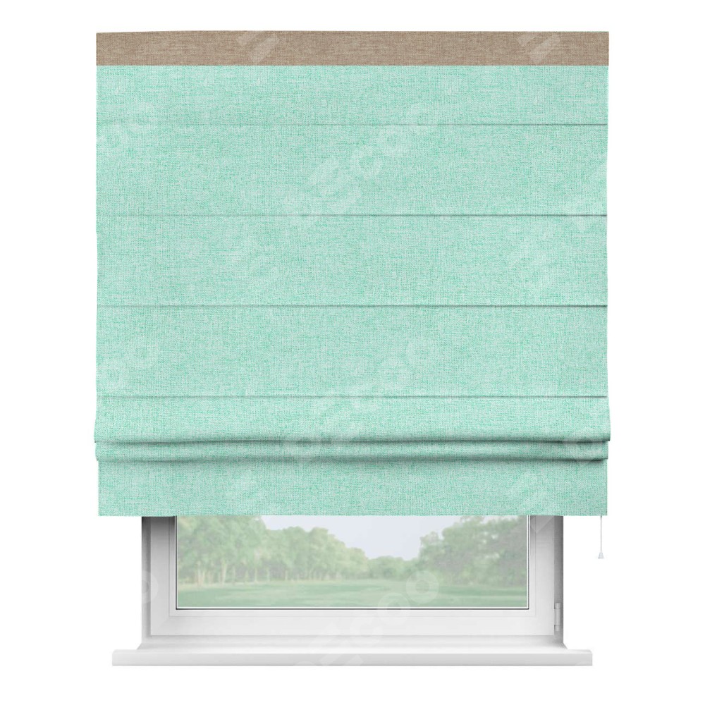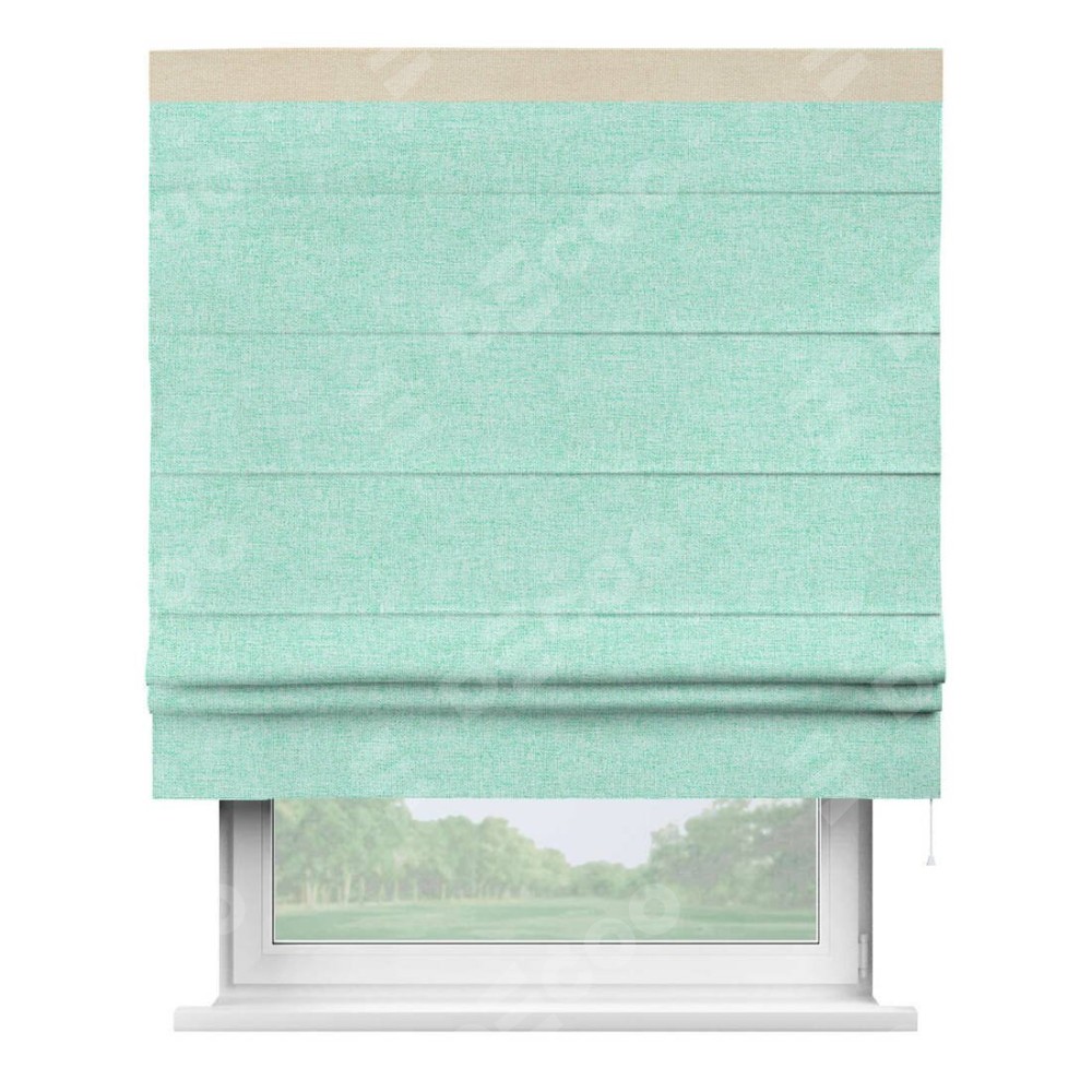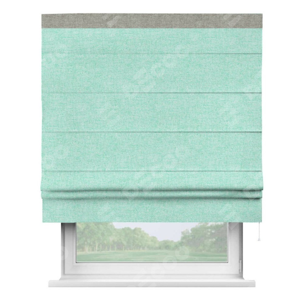 Римская штора пошита из ткани лён кашемир мятный, артикул: 21617, с отделкой кантом «Кинг» отличается своей необычной особенностью: кант располагается исключительно сверху шторы. Такой дизайн делает акцент на верхней части окна, визуально поднимая потолок и придавая интерьеру более возвышенный и изысканный вид. Отделка кантом на верхней кромке не только украшает штору, но и может служить дополнительной защитой от износа в месте наибольшего контакта с механизмом управления шторой.