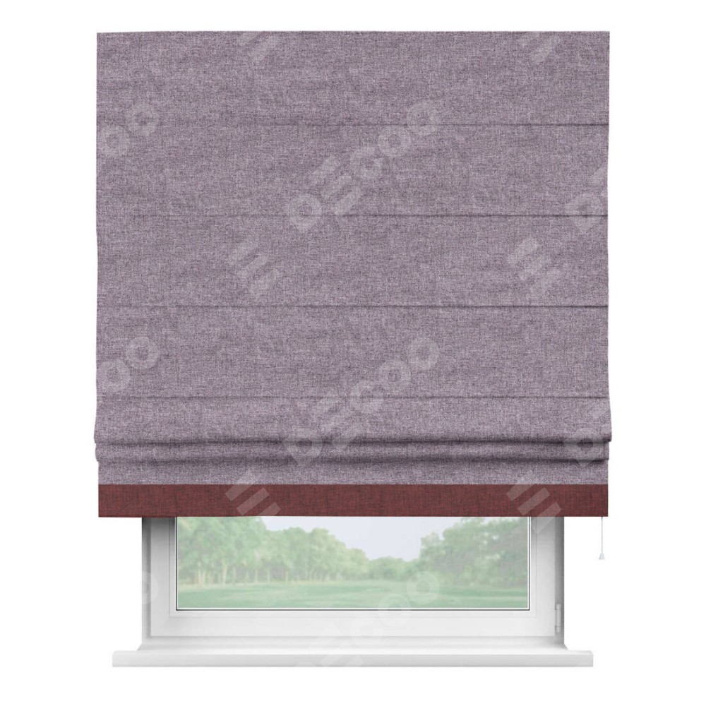 Римская штора пошита из ткани лён кашемир фиолетовый, артикул: 17211, с отделкой кантом «Джестер» выделяется своей уникальной особенностью — кантом, расположенным только снизу шторы. Этот дизайн добавляет оригинальности и игривости оконному оформлению, делая акцент на нижней части шторы и создавая интересный визуальный эффект. Отделка кантом на нижнем крае не только служит эстетической функции, но и способствует увеличению прочности и износостойкости ткани в этом месте.