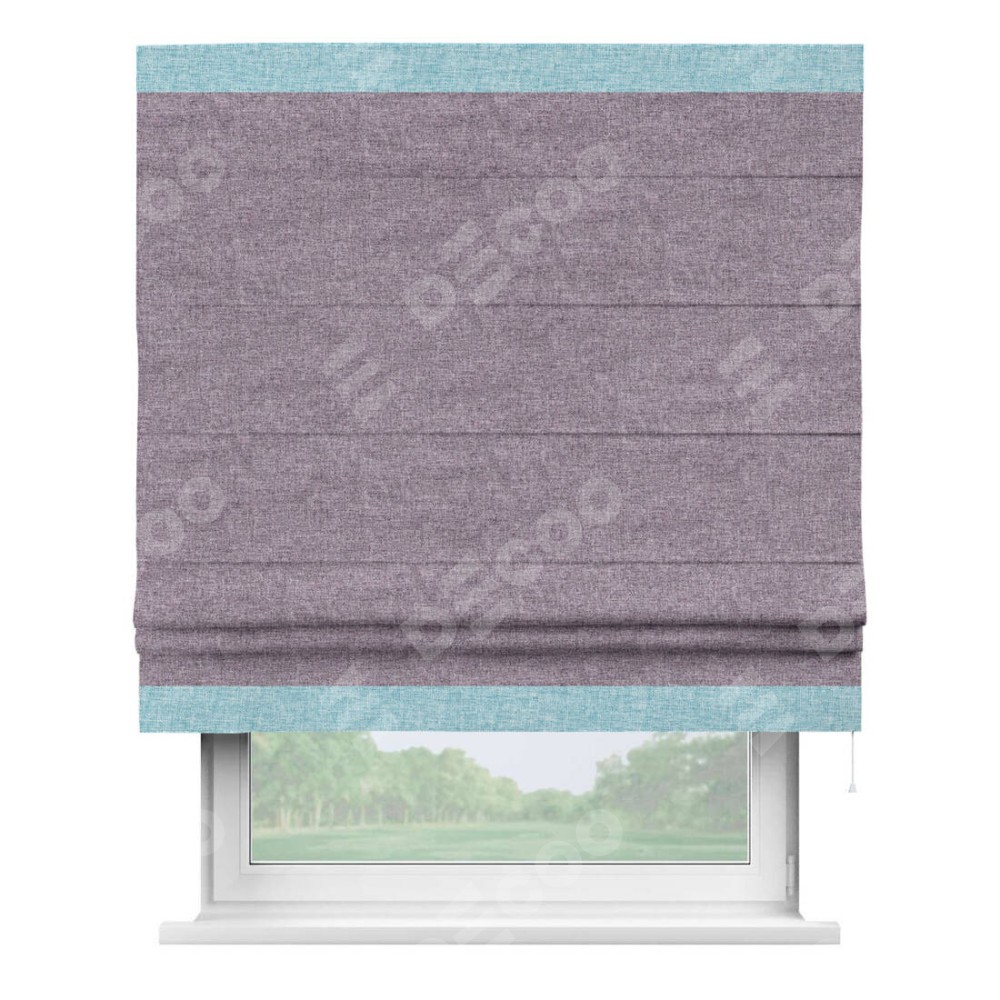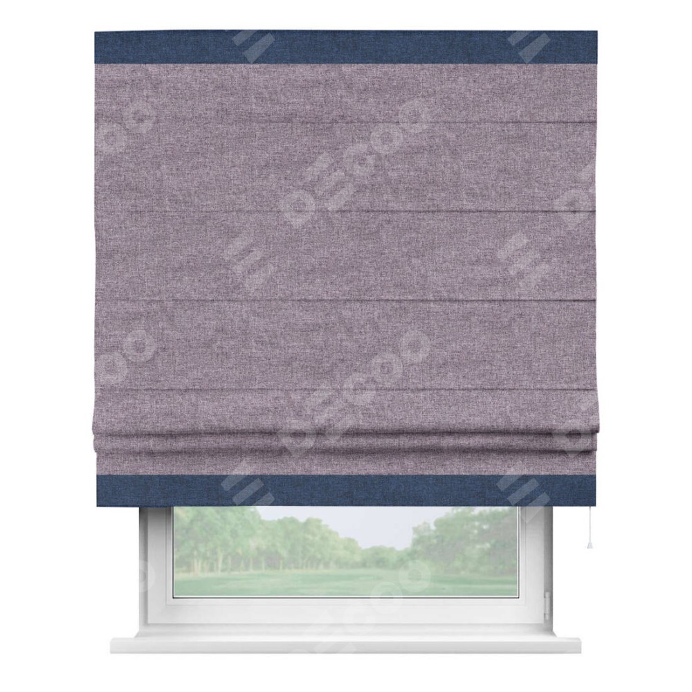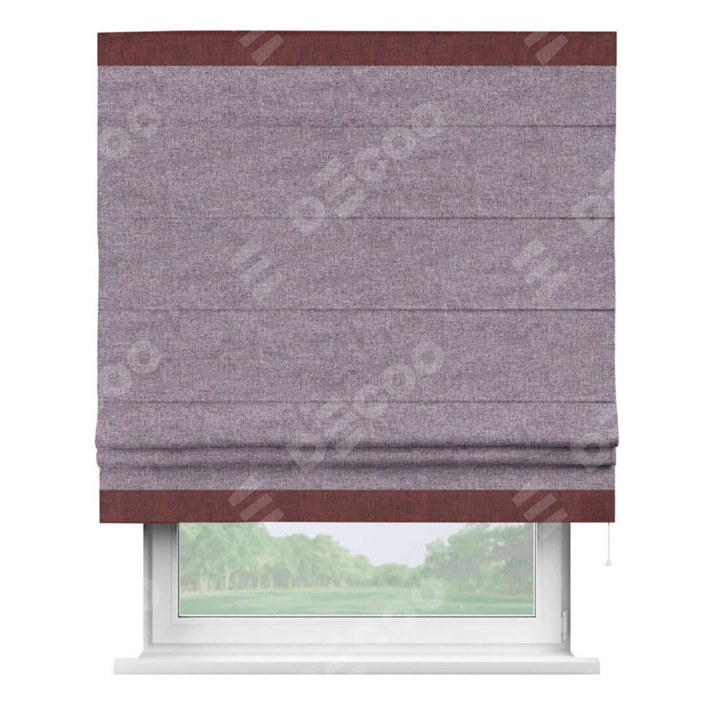 Римская штора пошита из ткани лён кашемир фиолетовый, артикул: 17211, с отделкой кантом «Горизонт» предлагает уникальное дизайнерское решение, при котором кант располагается только вверху и снизу шторы. Такое решение делает акцент на горизонтальных линиях, визуально расширяя пространство и придавая окну более строгий и организованный вид. Отделка кантом в этих ключевых местах не только украшает штору, но и способствует её долговечности, защищая наиболее уязвимые к износу края.