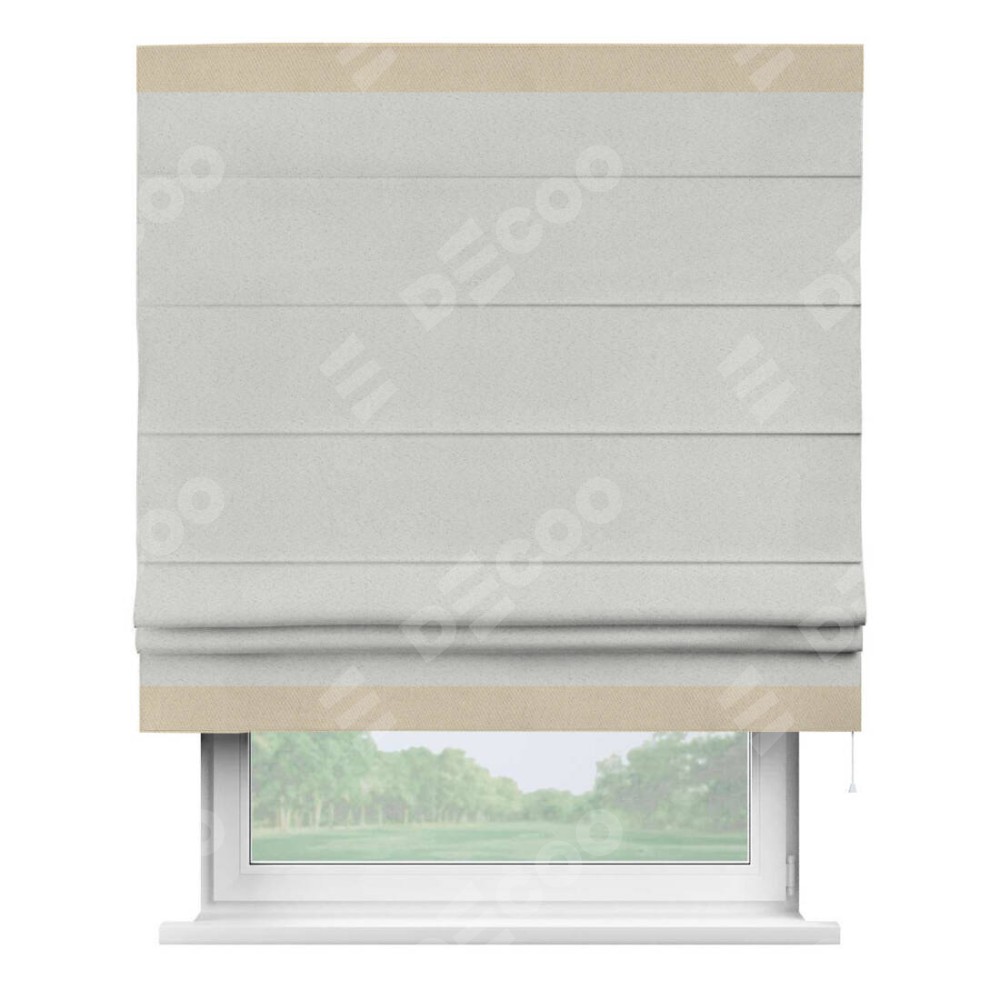 Римская штора пошита из ткани однотонный блэкаут милк, артикул: 23, с отделкой кантом «Горизонт» предлагает уникальное дизайнерское решение, при котором кант располагается только вверху и снизу шторы. Такое решение делает акцент на горизонтальных линиях, визуально расширяя пространство и придавая окну более строгий и организованный вид. Отделка кантом в этих ключевых местах не только украшает штору, но и способствует её долговечности, защищая наиболее уязвимые к износу края.