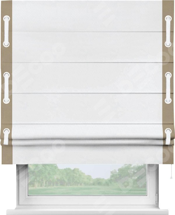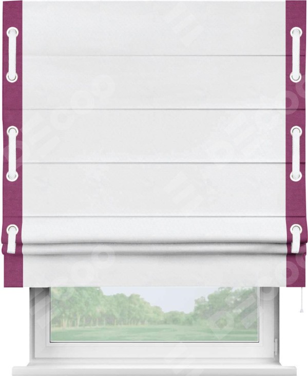 Римская штора пошита из ткани вельвет белоснежный, артикул: 92698, с отделкой кантом «Стрим Дуо», дополненная декоративными люверсами на этих кантах и протянутым пояском из основного цвета римской шторы, представляет собой высоко декоративное и функциональное решение для оконного оформления. Канты, расположенные по обеим боковым сторонам шторы, уже добавляют изысканности и завершенности внешнему виду. Добавление люверсов и пояска не только усиливает декоративный эффект, но и придает шторе дополнительную текстурность и глубину.