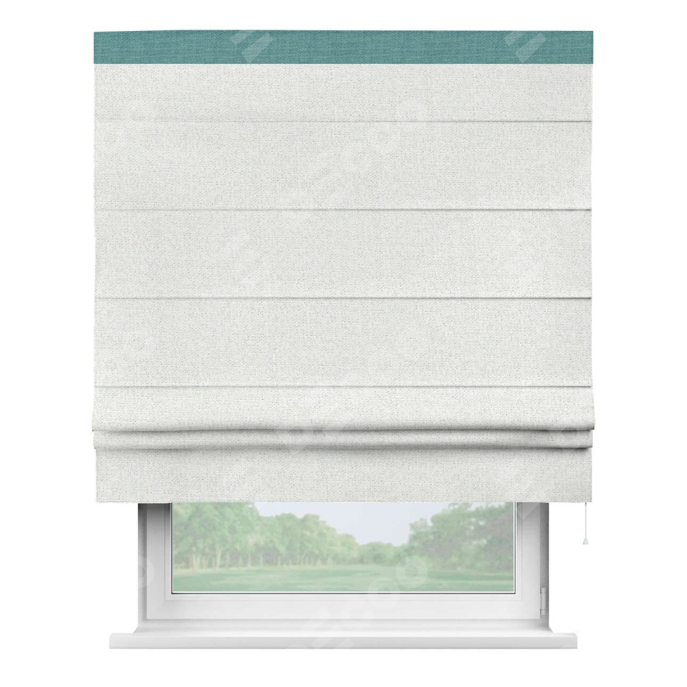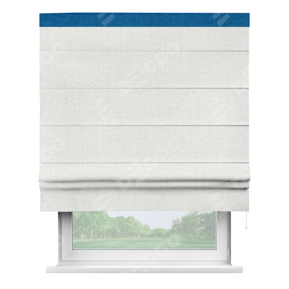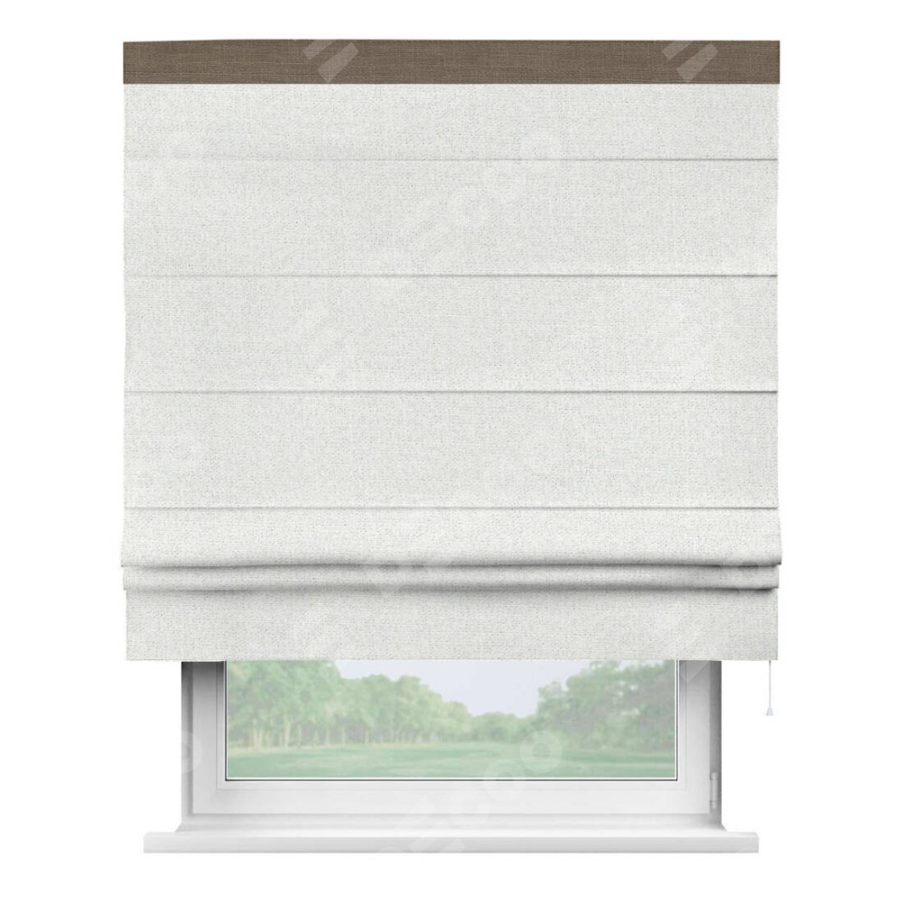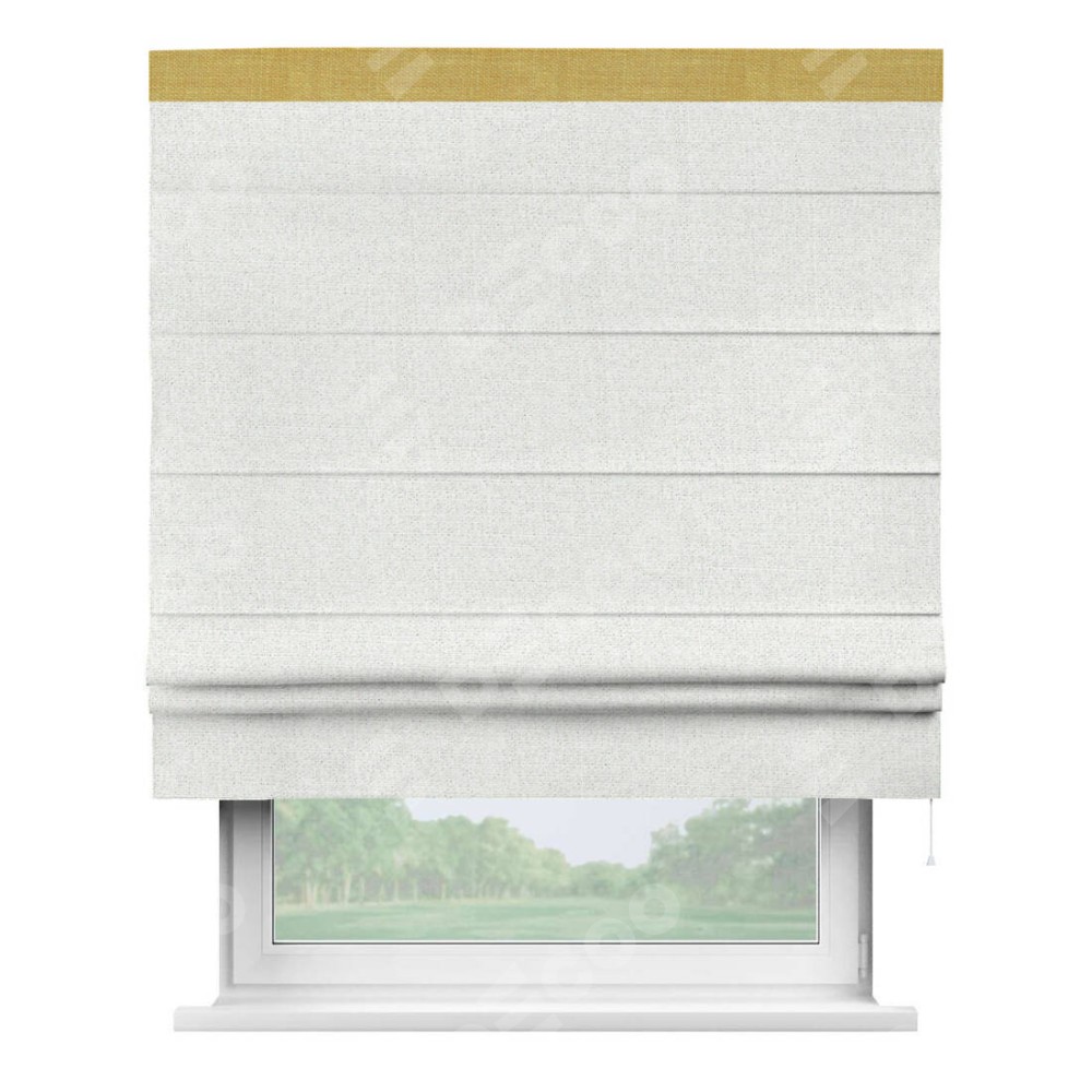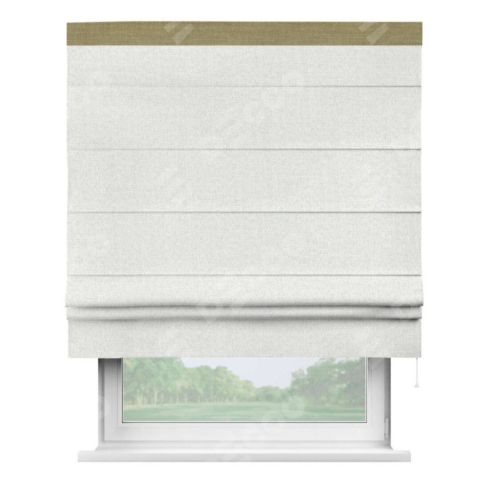 Римская штора пошита из ткани лён шампань, артикул: 91399, с отделкой кантом «Кинг» отличается своей необычной особенностью: кант располагается исключительно сверху шторы. Такой дизайн делает акцент на верхней части окна, визуально поднимая потолок и придавая интерьеру более возвышенный и изысканный вид. Отделка кантом на верхней кромке не только украшает штору, но и может служить дополнительной защитой от износа в месте наибольшего контакта с механизмом управления шторой.