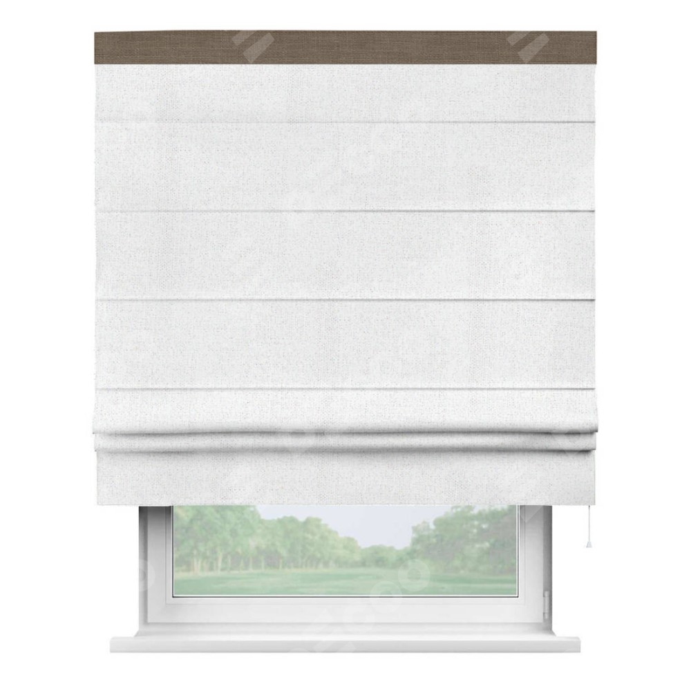Римская штора пошита из ткани лён белоснежный, артикул: 95632, с отделкой кантом «Кинг» отличается своей необычной особенностью: кант располагается исключительно сверху шторы. Такой дизайн делает акцент на верхней части окна, визуально поднимая потолок и придавая интерьеру более возвышенный и изысканный вид. Отделка кантом на верхней кромке не только украшает штору, но и может служить дополнительной защитой от износа в месте наибольшего контакта с механизмом управления шторой.