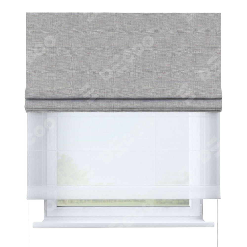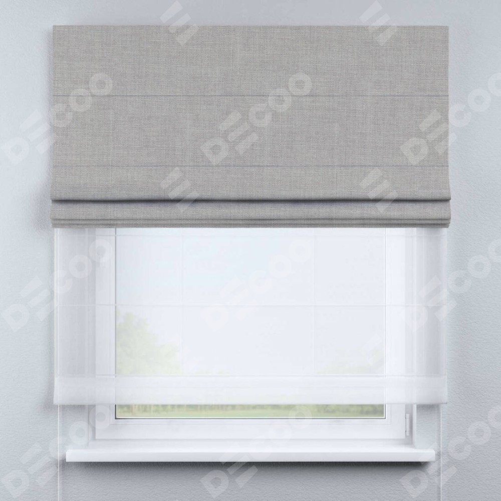 Двойная римская штора «День-ночь» от производителя Cortin предназначена для использования в проёмах. Эта штора уникальна тем, что состоит из двух полотен. На лицевой стороне находится лён серый (артикул: 91410), обеспечивающий эффективное затемнение. В комплект также входит вторая ткань — легкий белый тюль (артикул: V-01), который добавляет изящества и легкости оформлению окна. Кроме того, доступны и другие разновидности ткани тюль, выбор которых доступен по  ссылке .