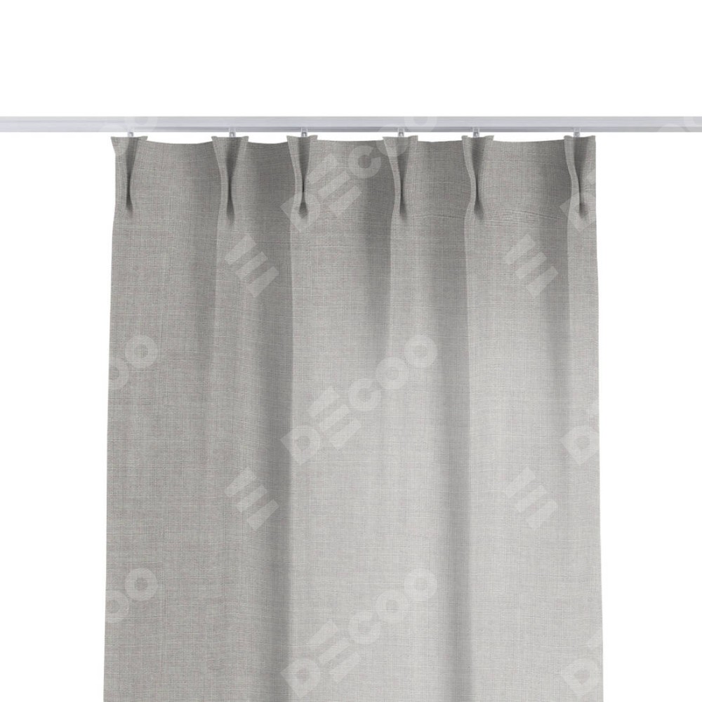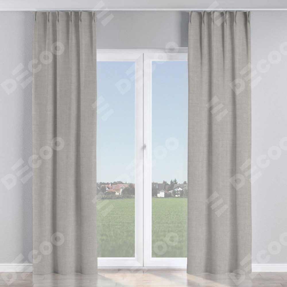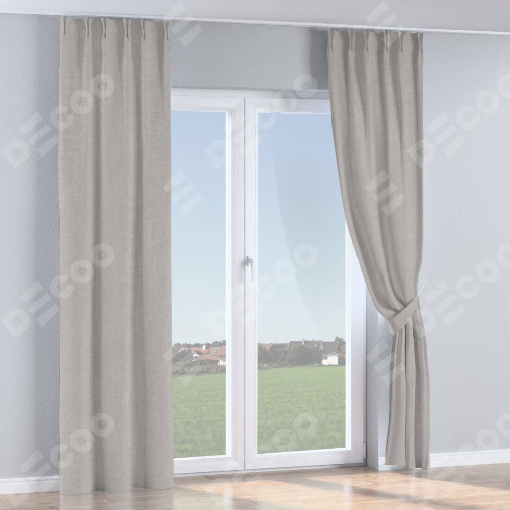 Комплект прямых штор, от производителя «Cortin», пошиты из ткани лён серый, артикул ткани 91410. С изнаночной стороны в верхней части штор пристрачивается шторная лента с декоративными складками «Кустик». Для создания элегантных складок прямые шторы шьются по стандарту с коэффициентом 1:2 (на 100 см. ширины проёма 200 см. ширины ткани).