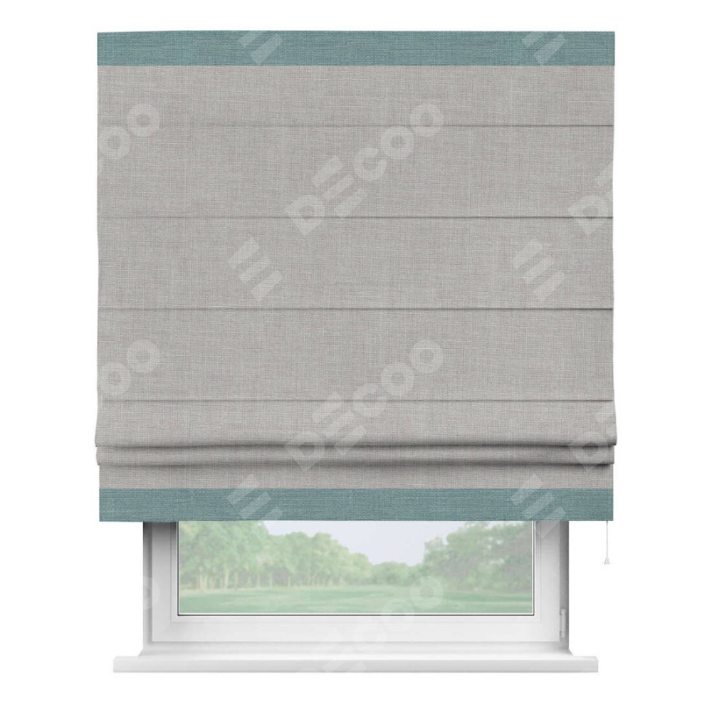 Римская штора пошита из ткани лён серый, артикул: 91410, с отделкой кантом «Горизонт» предлагает уникальное дизайнерское решение, при котором кант располагается только вверху и снизу шторы. Такое решение делает акцент на горизонтальных линиях, визуально расширяя пространство и придавая окну более строгий и организованный вид. Отделка кантом в этих ключевых местах не только украшает штору, но и способствует её долговечности, защищая наиболее уязвимые к износу края.