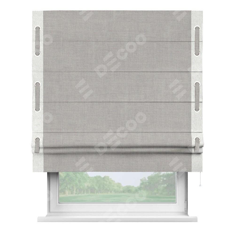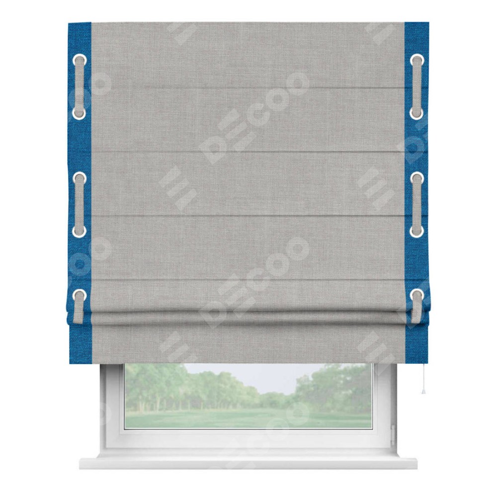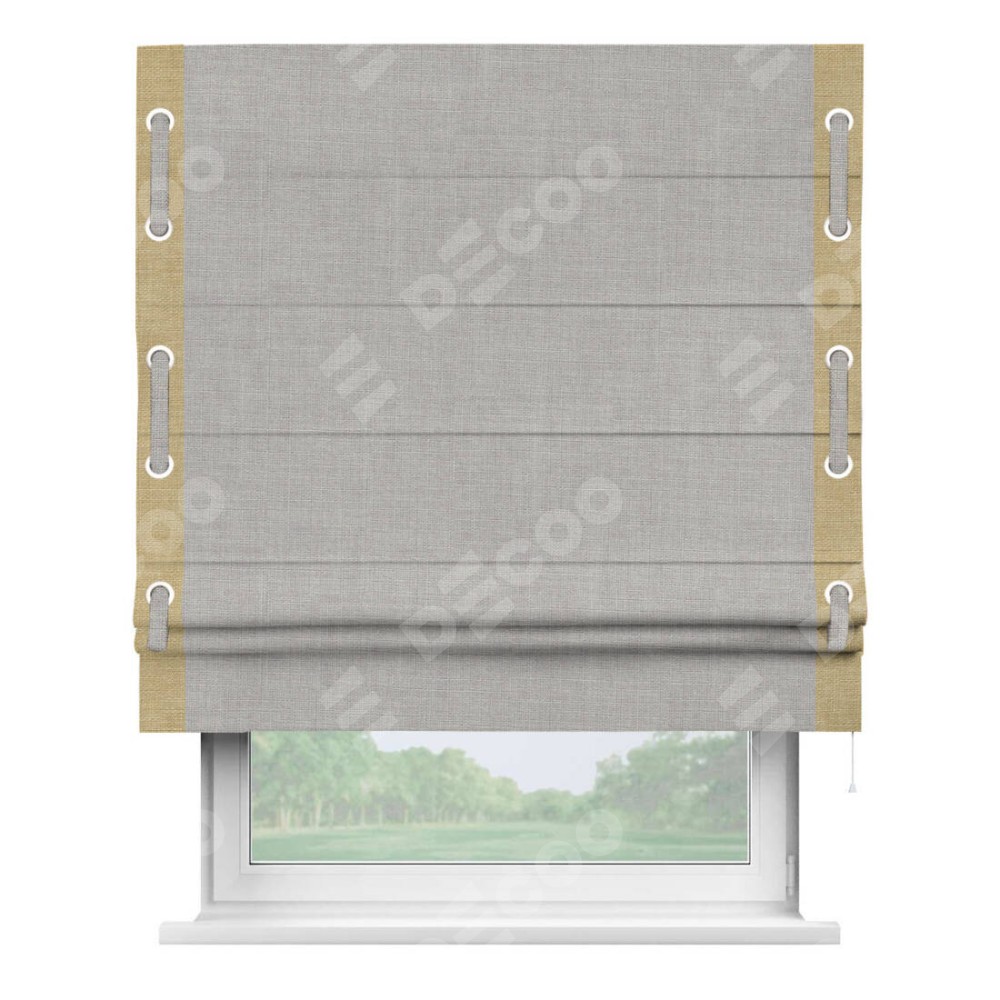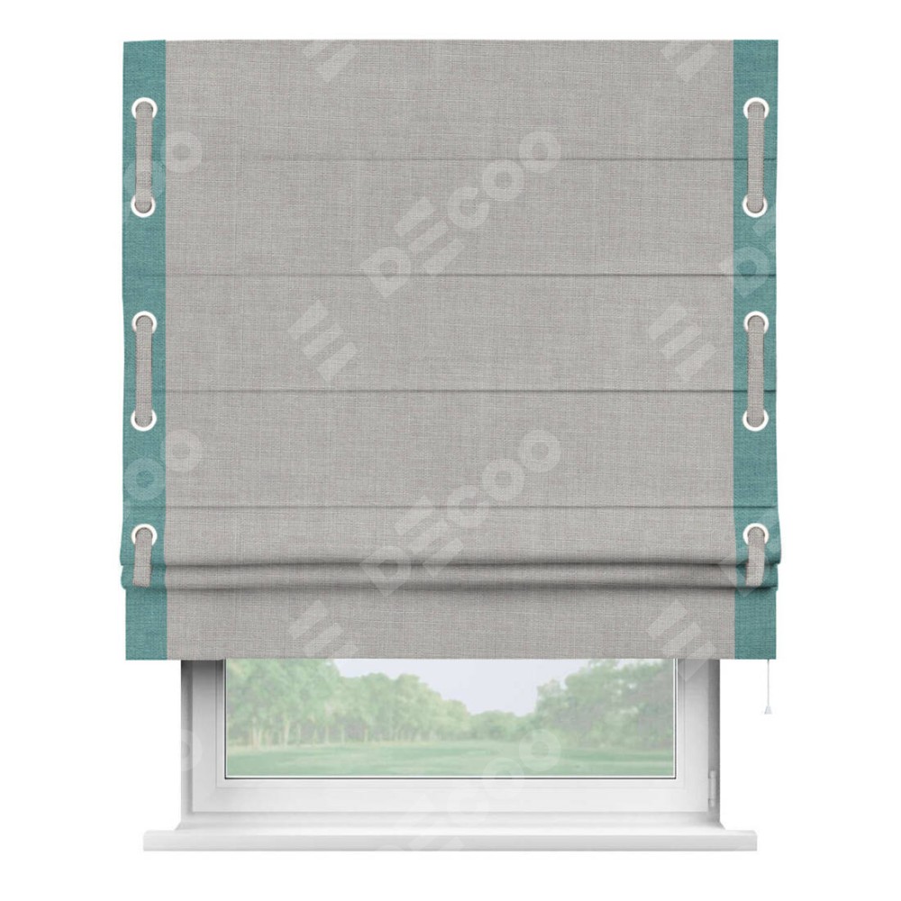 Римская штора «Кортин» для проёма, лён серый, с кантом Стрим Дуо (люверсы с пояском)
