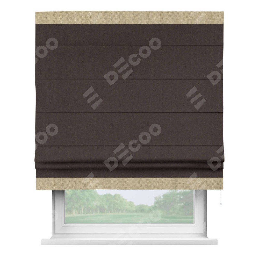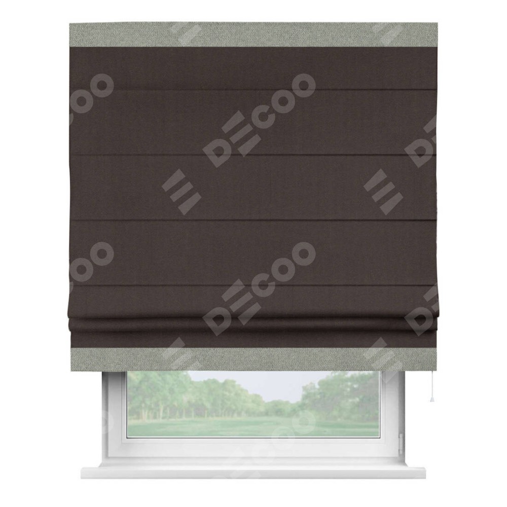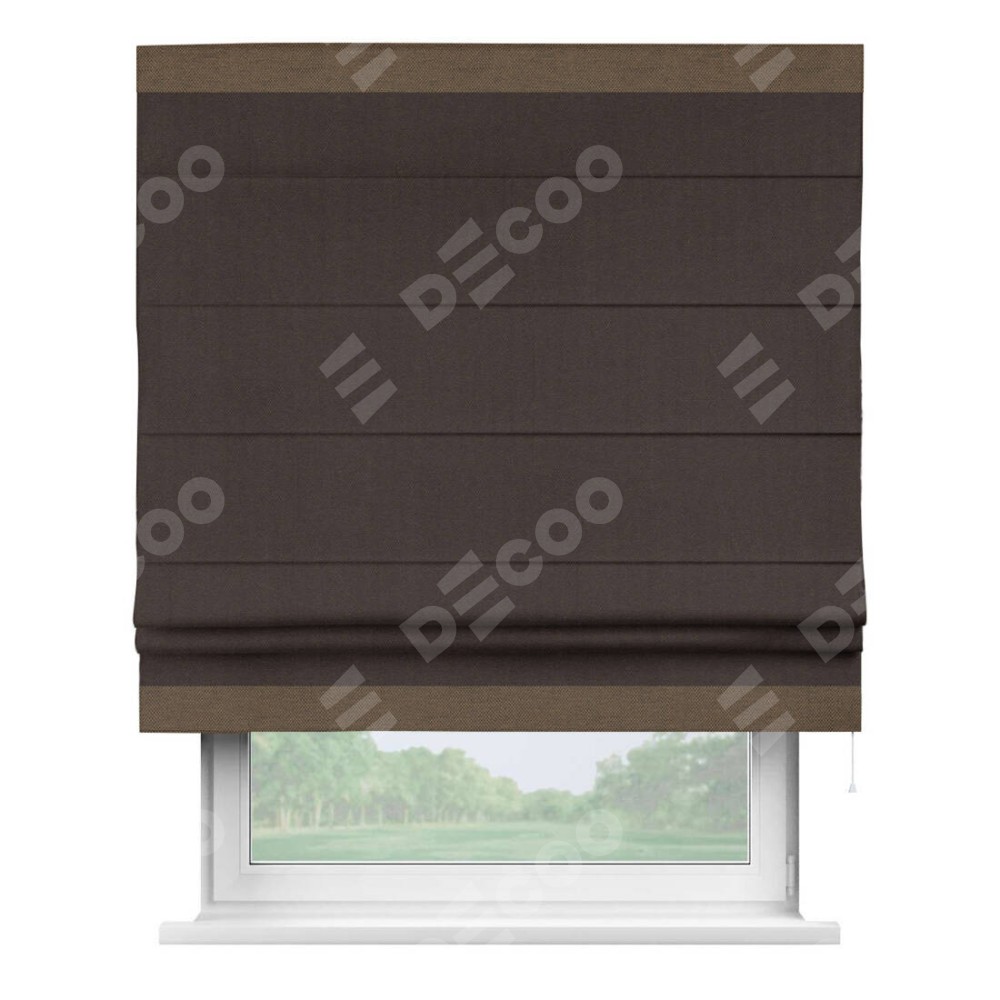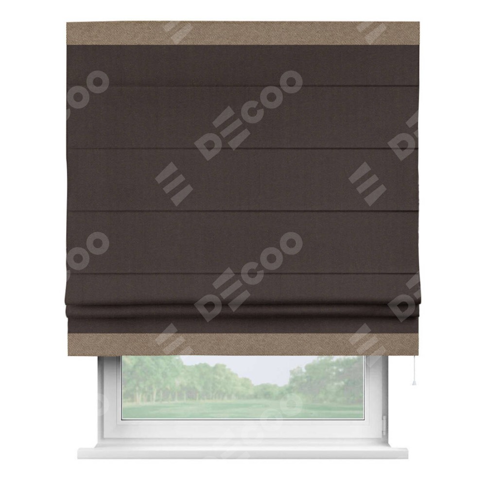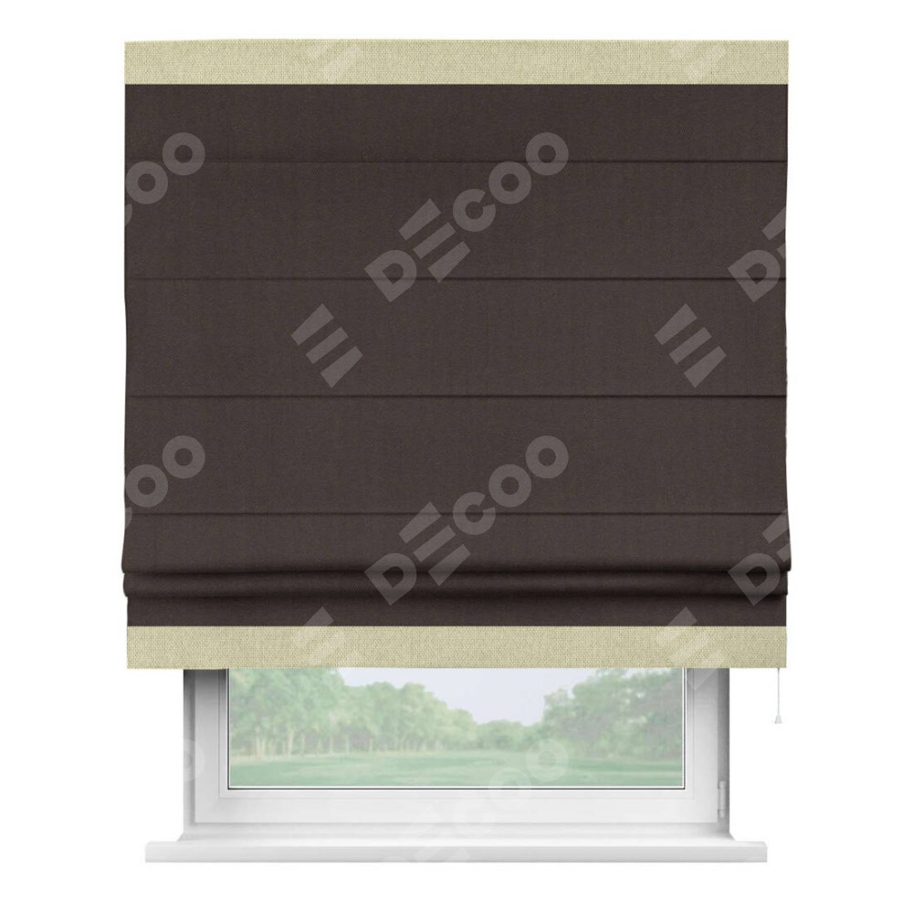 Римская штора пошита из ткани лён димаут венге, артикул: 91001, с отделкой кантом «Горизонт» предлагает уникальное дизайнерское решение, при котором кант располагается только вверху и снизу шторы. Такое решение делает акцент на горизонтальных линиях, визуально расширяя пространство и придавая окну более строгий и организованный вид. Отделка кантом в этих ключевых местах не только украшает штору, но и способствует её долговечности, защищая наиболее уязвимые к износу края.