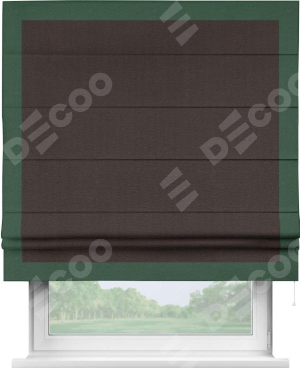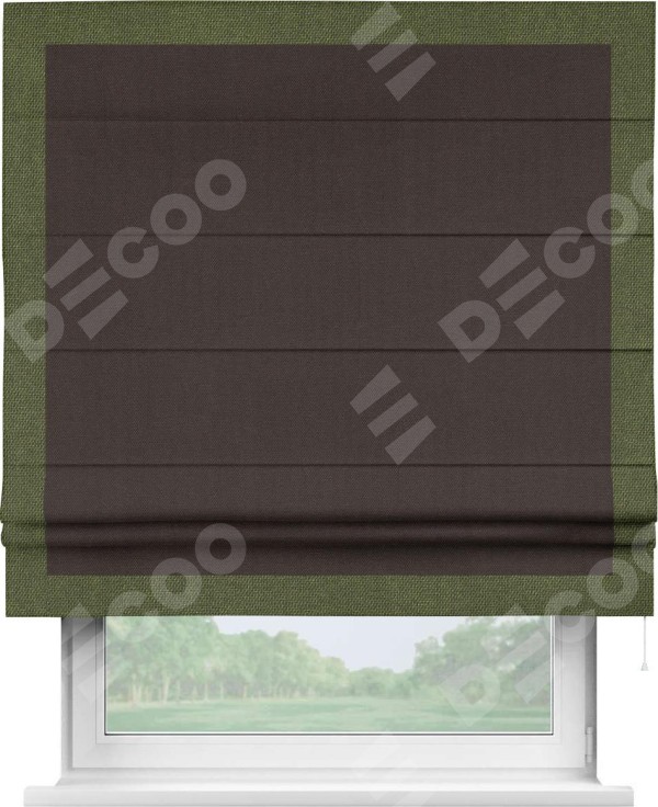 Римская штора пошита из ткани лён димаут венге, артикул: 91001, с отделкой кантом «Чесс» отличается своей уникальной деталью — наличием канта не только по бокам и снизу, но и сверху по всем краям шторы. Это придает шторе особенно аккуратный и завершенный вид, делая акцент на границах и форме шторы. Отделка кантом по всему периметру шторы усиливает её декоративные качества и подчеркивает строгую геометрию, что может быть особенно актуально для современных и минималистичных интерьеров.