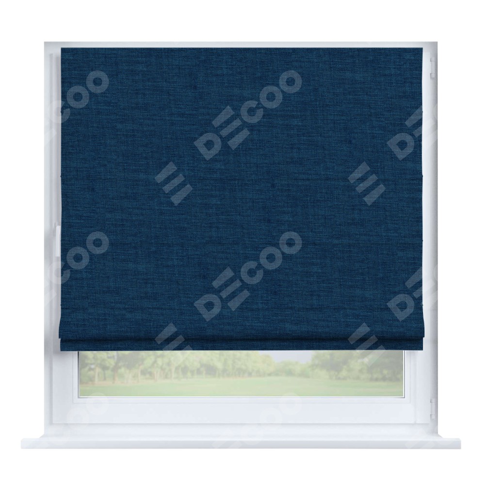 Римская штора производителя «Cortin», устанавливается на створку окна, пошита из ткани лён синий, артикул 104496. Штора шьётся по индивидуальным размерам, для данного типа римской шторы возможная ширина от 35 до 150 см., высота до 250 см.