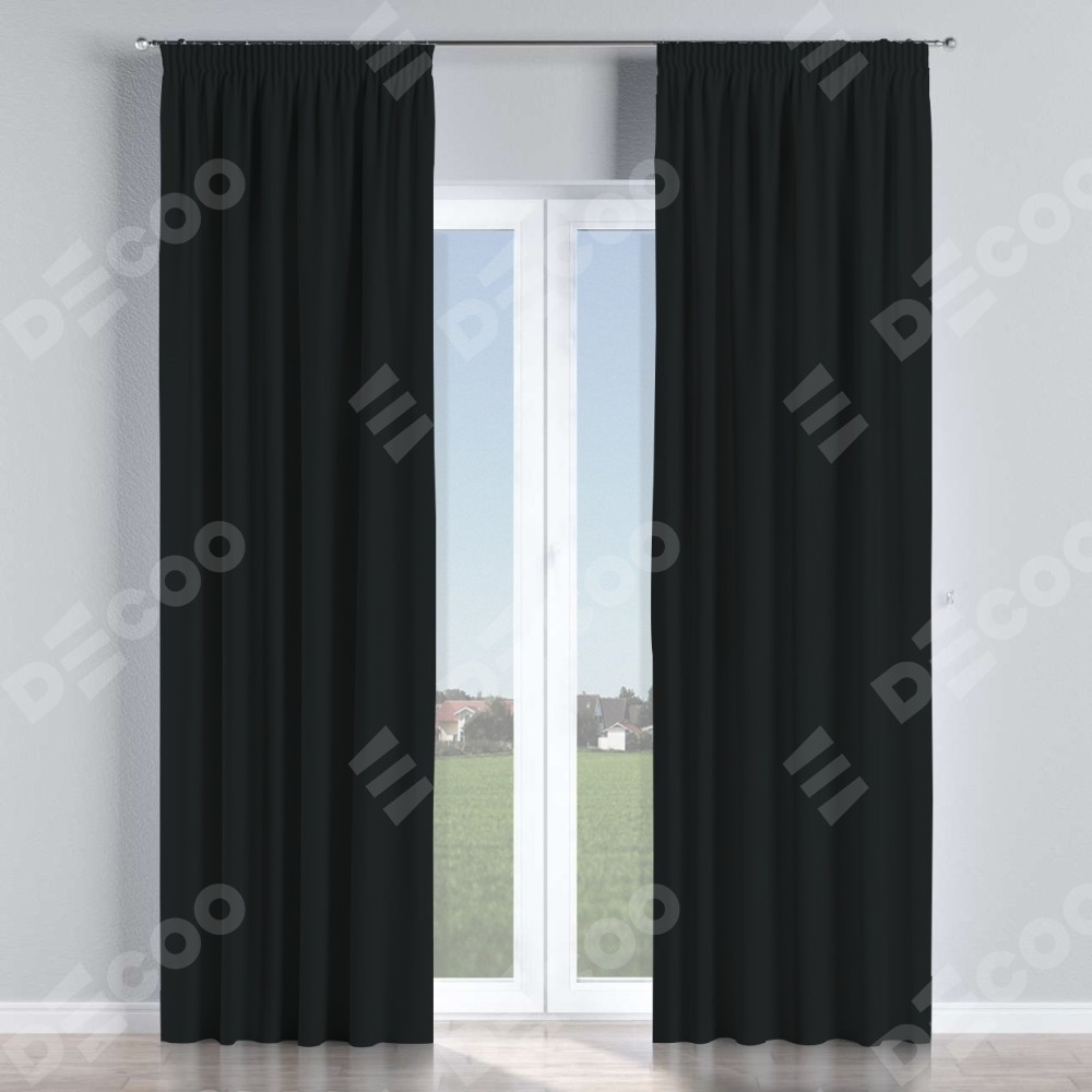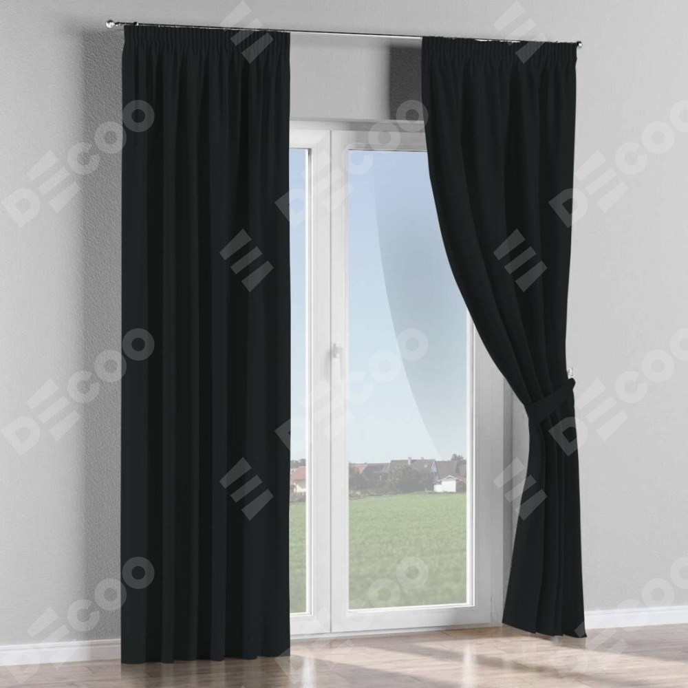 Комплект прямых штор, от производителя «Cortin», пошиты из ткани блэкаут однотонный черный, артикул ткани 37. С изнаночной стороны в верхней части штор пристрачивается шторная лента с декоративными складками «Карандаш». Для создания элегантных складок прямые шторы шьются по стандарту с коэффициентом 1:2 (на 100 см. ширины проёма 200 см. ширины ткани).