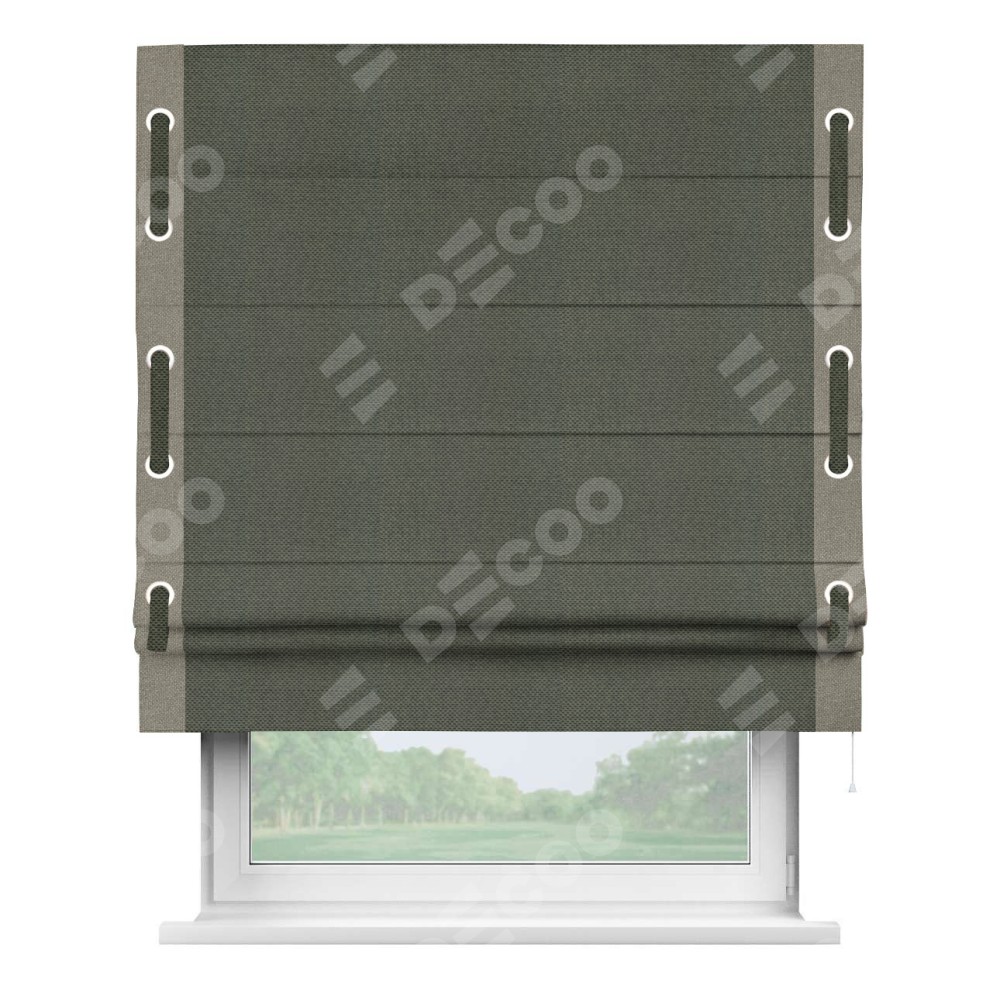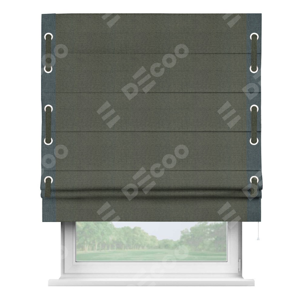 Римская штора производителя «Cortin», используется для проёма, пошита из ткани лён димаут графит, артикул 27. Отделка шторы кантом «Стрим Дуо» на кантах расположены люверсы с пояском, ткань для канта используется лён димаут разной расцветки на выбор. Ткань для пояска обычно используется из основной ткани шторы, а так же можно сделать из любой расцветки по желанию. Имеет универсальный механизм и подходит для монтажа: на потолок, на стену и в нишу.