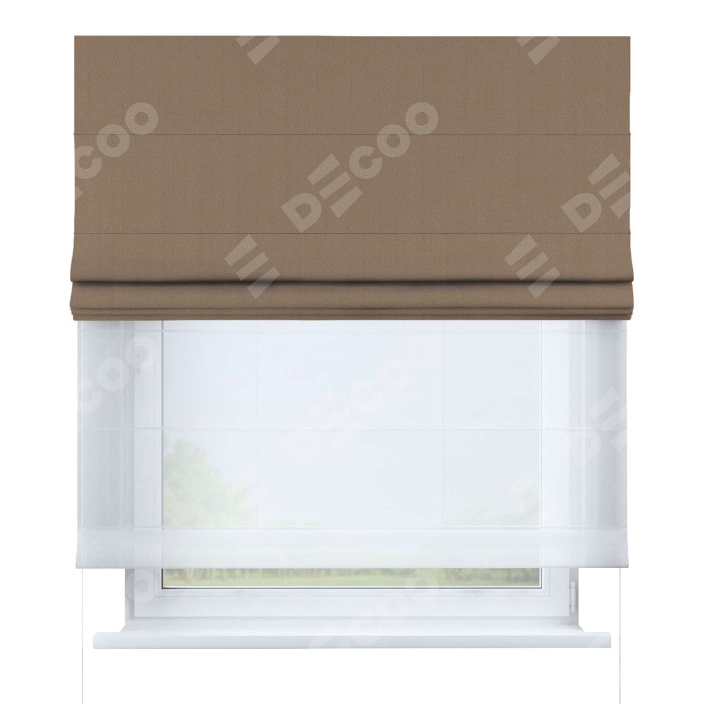 Двойная римская штора «День-ночь» от производителя Cortin предназначена для использования в проёмах. Эта штора уникальна тем, что состоит из двух полотен. На лицевой стороне находится однотонный блэкаут кофейно-бежевый (артикул: 91566−2), обеспечивающий эффективное затемнение. В комплект также входит вторая ткань — легкий белый тюль (артикул: V-01), который добавляет изящества и легкости оформлению окна. Кроме того, доступны и другие разновидности ткани тюль, выбор которых доступен по  ссылке .