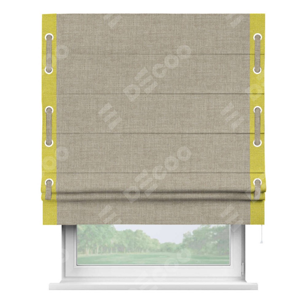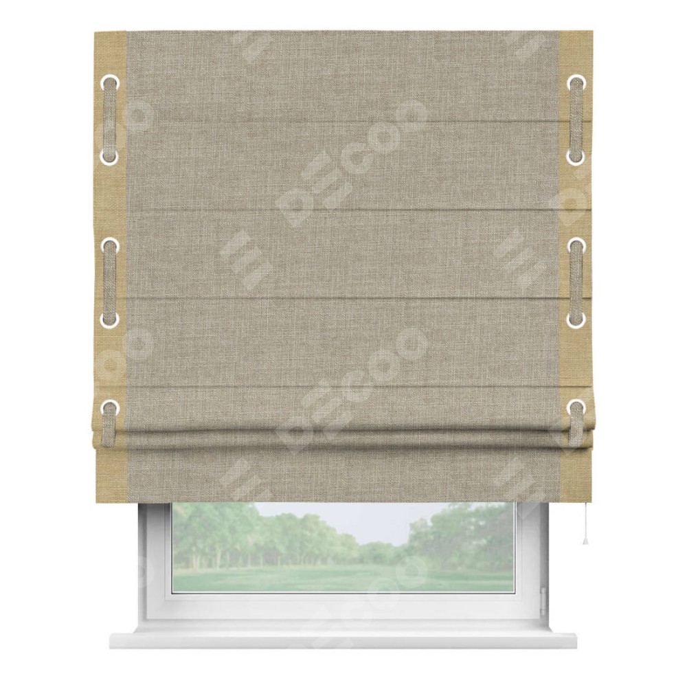 Римская штора «Кортин» для проёма, лён бежевый, с кантом Стрим Дуо (люверсы с пояском)