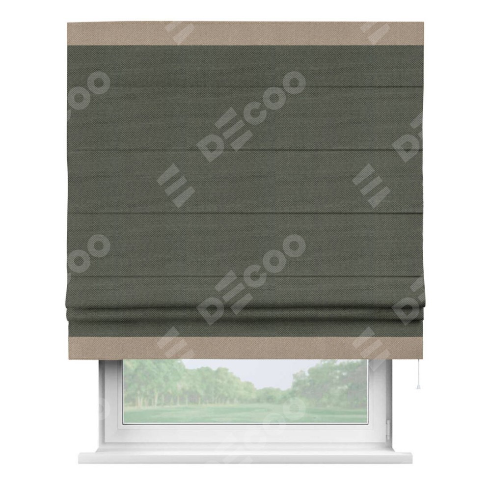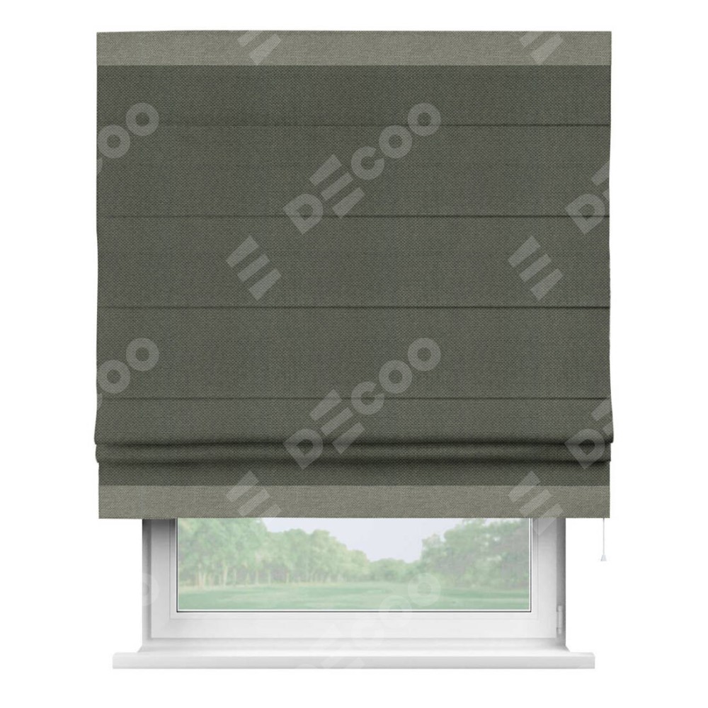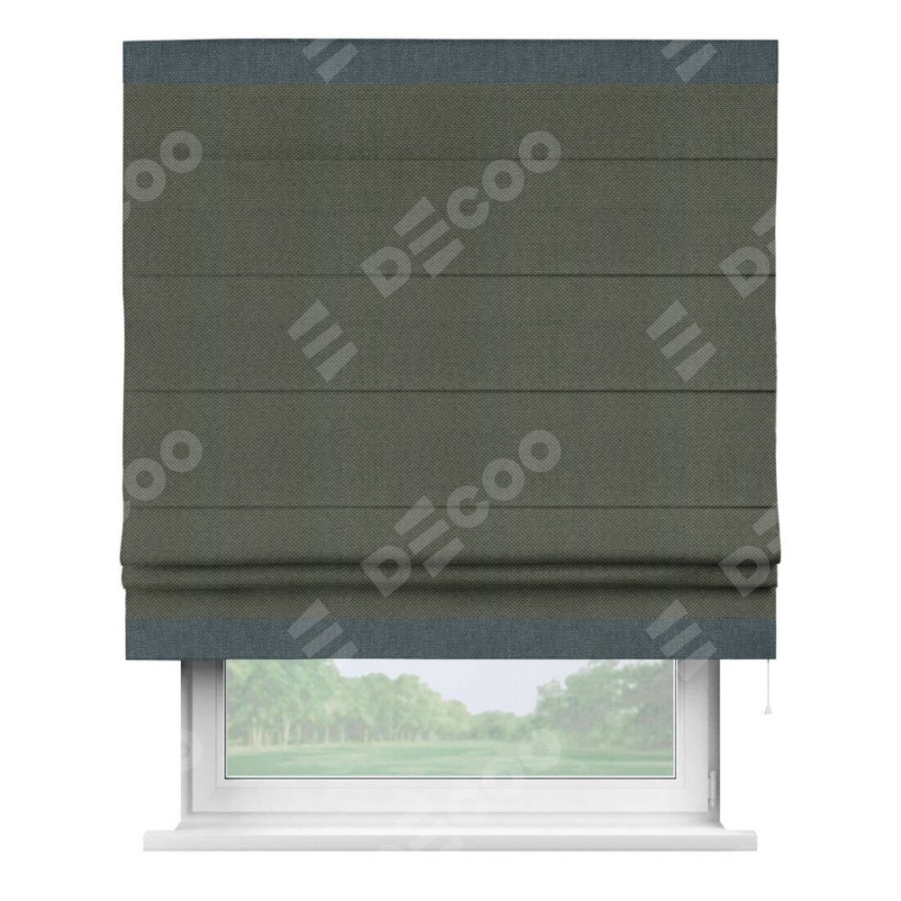 Римская штора производителя «Cortin», используется для проёма, пошита из ткани лён димаут графит, артикул 27. Отделка шторы кантом «Горизонт», ткань для канта используется из льна димаут разной расцветки на выбор. Имеет универсальный механизм и подходит для монтажа: на потолок, на стену и в нишу.