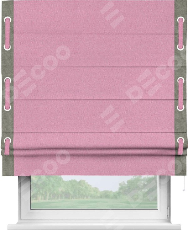 Римская штора производителя «Cortin», используется для проёма, пошита из ткани лён димаут розовый, артикул 16257. Отделка шторы кантом «Стрим Дуо» на кантах расположены люверсы с пояском, ткань для канта используется лён димаут разной расцветки на выбор. Ткань для пояска обычно используется из основной ткани шторы, а так же можно сделать из любой расцветки по желанию. Имеет универсальный механизм и подходит для монтажа: на потолок, на стену и в нишу.