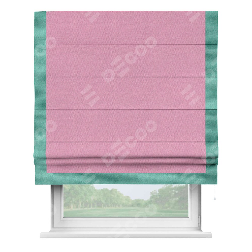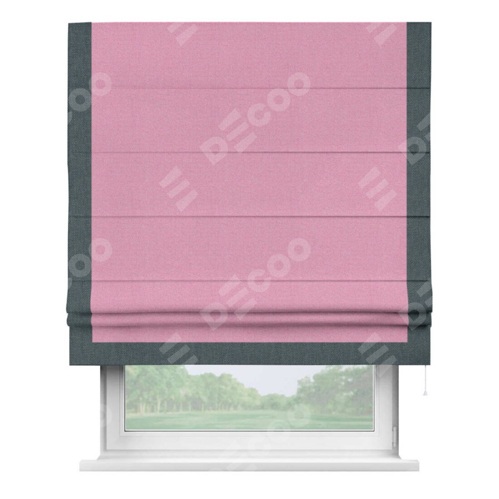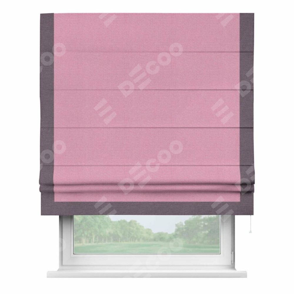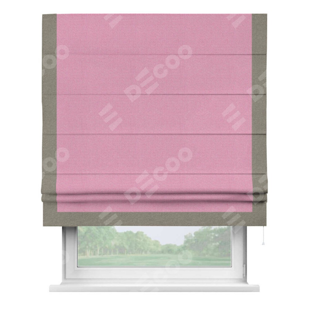 Римская штора производителя «Cortin», используется для проёма, пошита из ткани лён димаут розовый, артикул 16257. Отделка шторы кантом «Виктория», ткань для канта используется из льна димаут разной расцветки на выбор. Имеет универсальный механизм и подходит для монтажа: на потолок, на стену и в нишу.