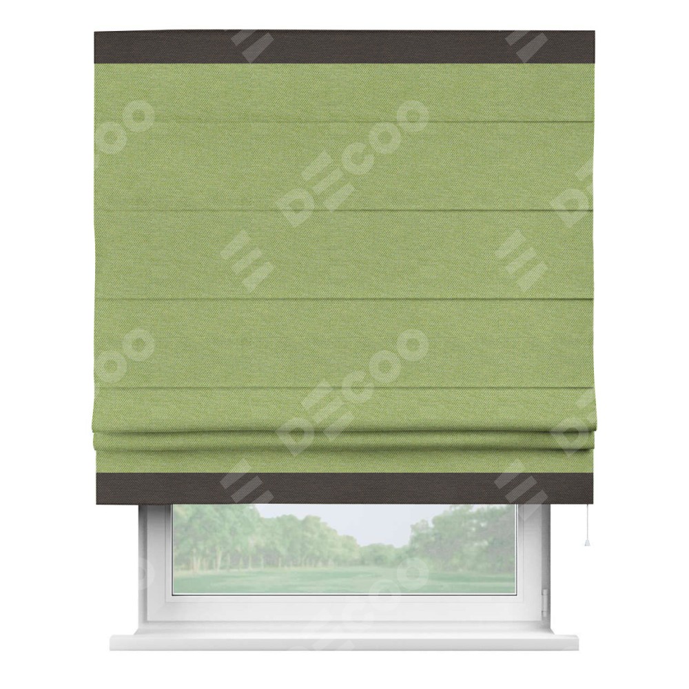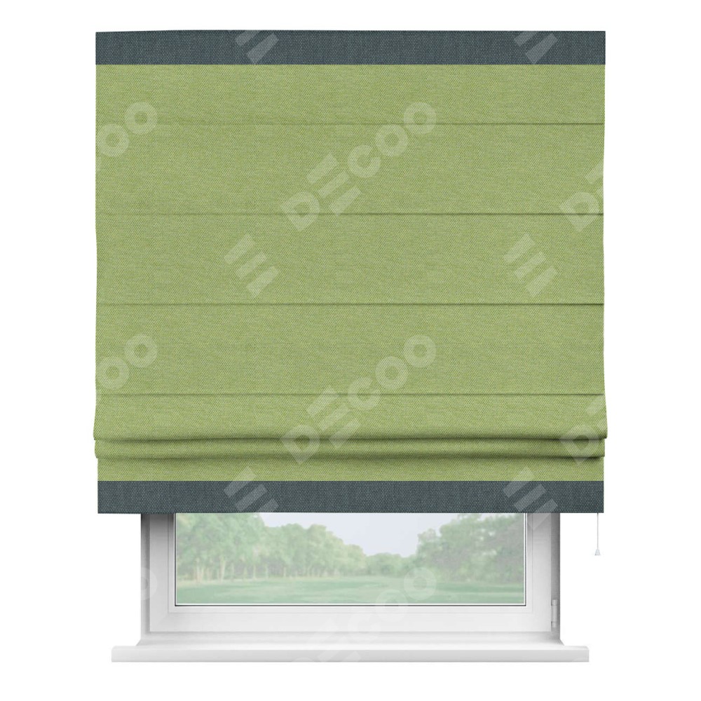 Римская штора производителя «Cortin», используется для проёма, пошита из ткани лён димаут салатовый, артикул 83032. Отделка шторы кантом «Горизонт», ткань для канта используется из льна димаут разной расцветки на выбор. Имеет универсальный механизм и подходит для монтажа: на потолок, на стену и в нишу.