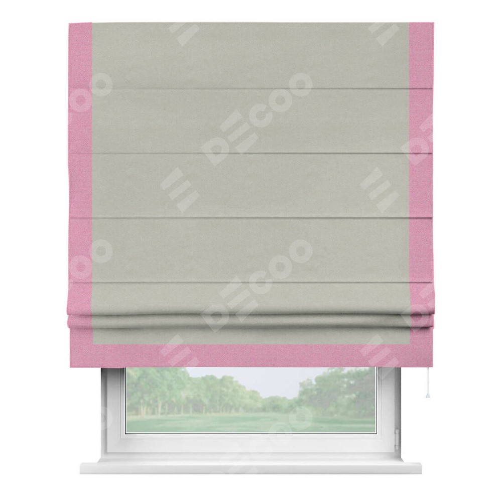 Римская штора производителя «Cortin», используется для проёма, пошита из ткани лён димаут светло-серый, артикул 83025. Отделка шторы кантом «Виктория», ткань для канта используется из льна димаут разной расцветки на выбор. Имеет универсальный механизм и подходит для монтажа: на потолок, на стену и в нишу.