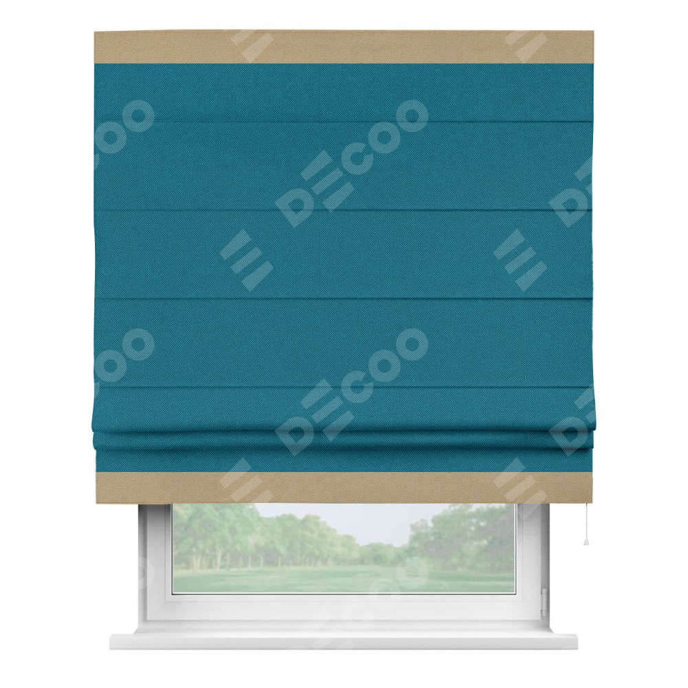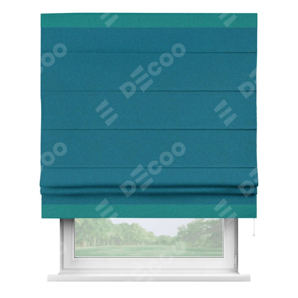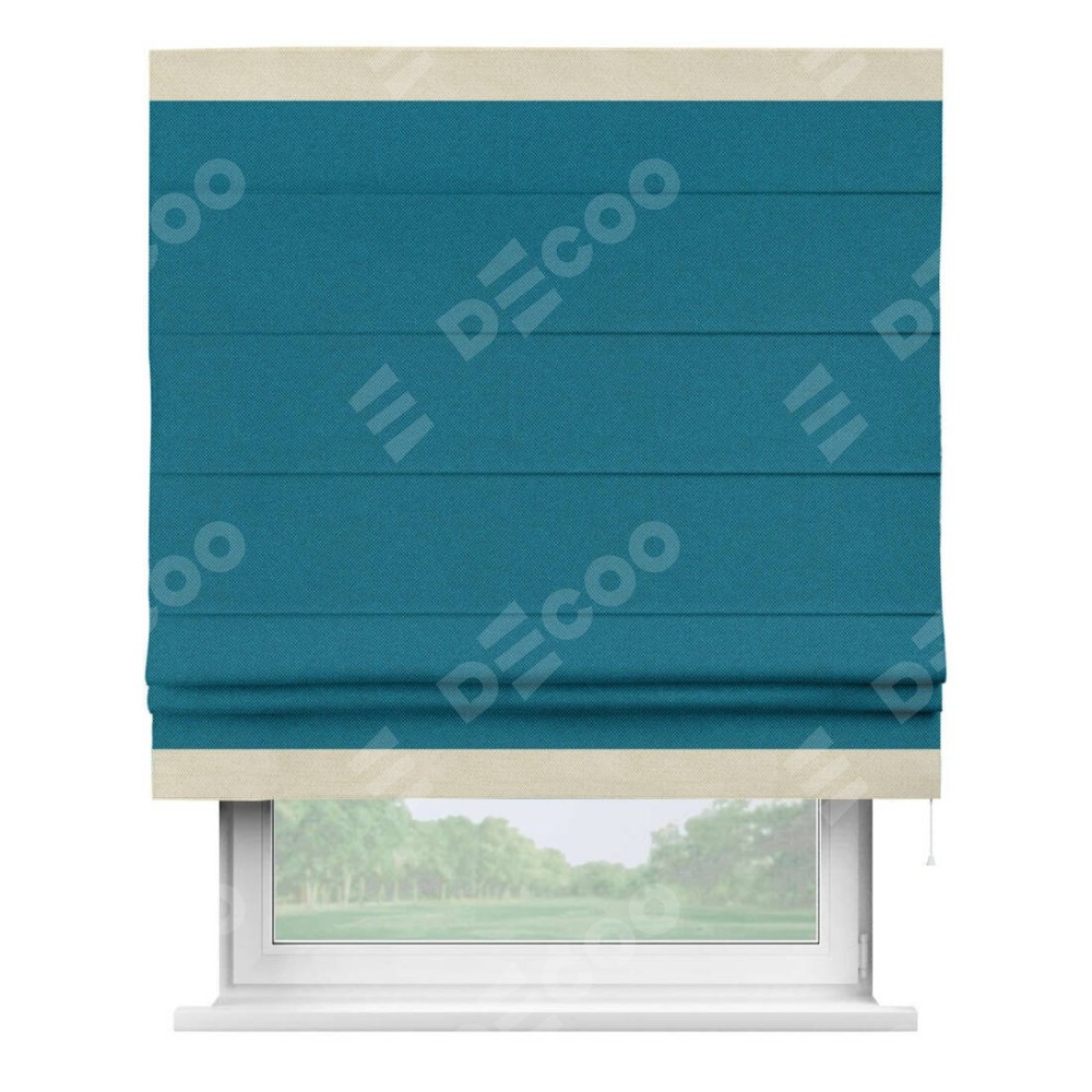 Римская штора производителя «Cortin», используется для проёма, пошита из ткани лён димаут светло-синий, артикул 02. Отделка шторы кантом «Горизонт», ткань для канта используется из льна димаут разной расцветки на выбор. Имеет универсальный механизм и подходит для монтажа: на потолок, на стену и в нишу.
