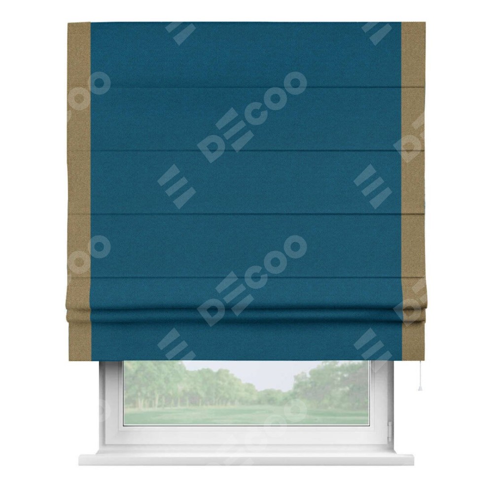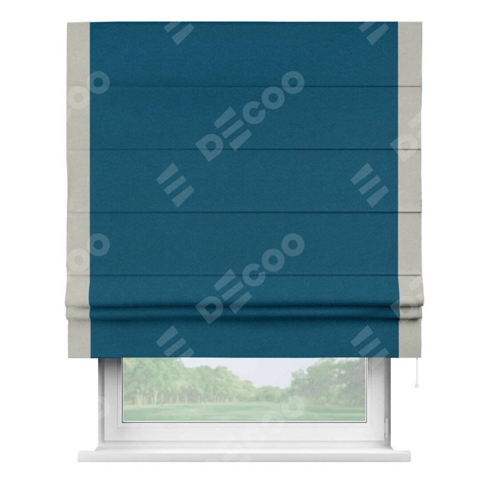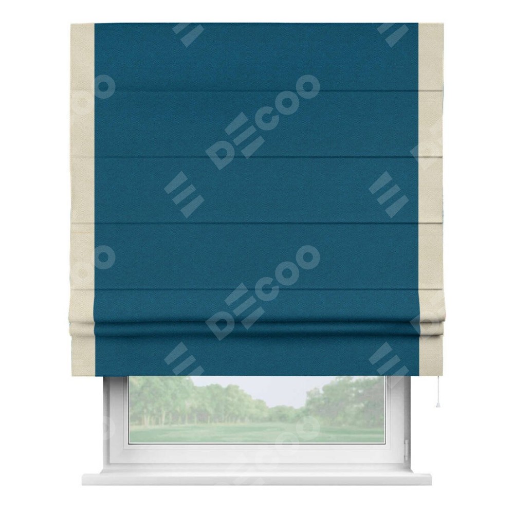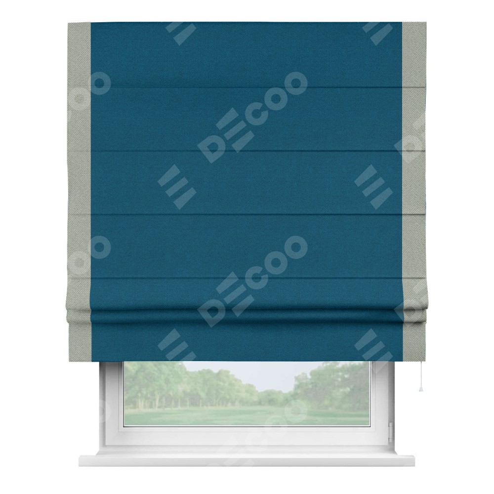 Римская штора производителя «Cortin», используется для проёма, пошита из ткани лён димаут синий, артикул 16260. Отделка шторы кантом «Стрим Дуо», ткань для канта используется из льна димаут разной расцветки на выбор. Имеет универсальный механизм и подходит для монтажа: на потолок, на стену и в нишу.