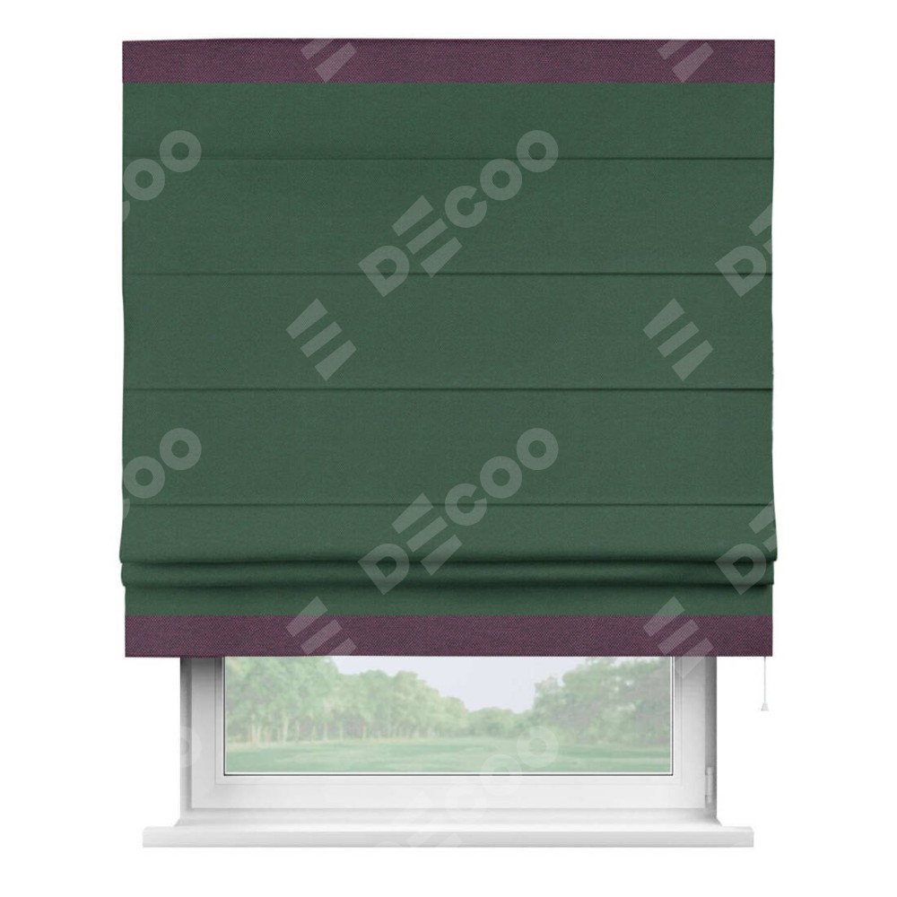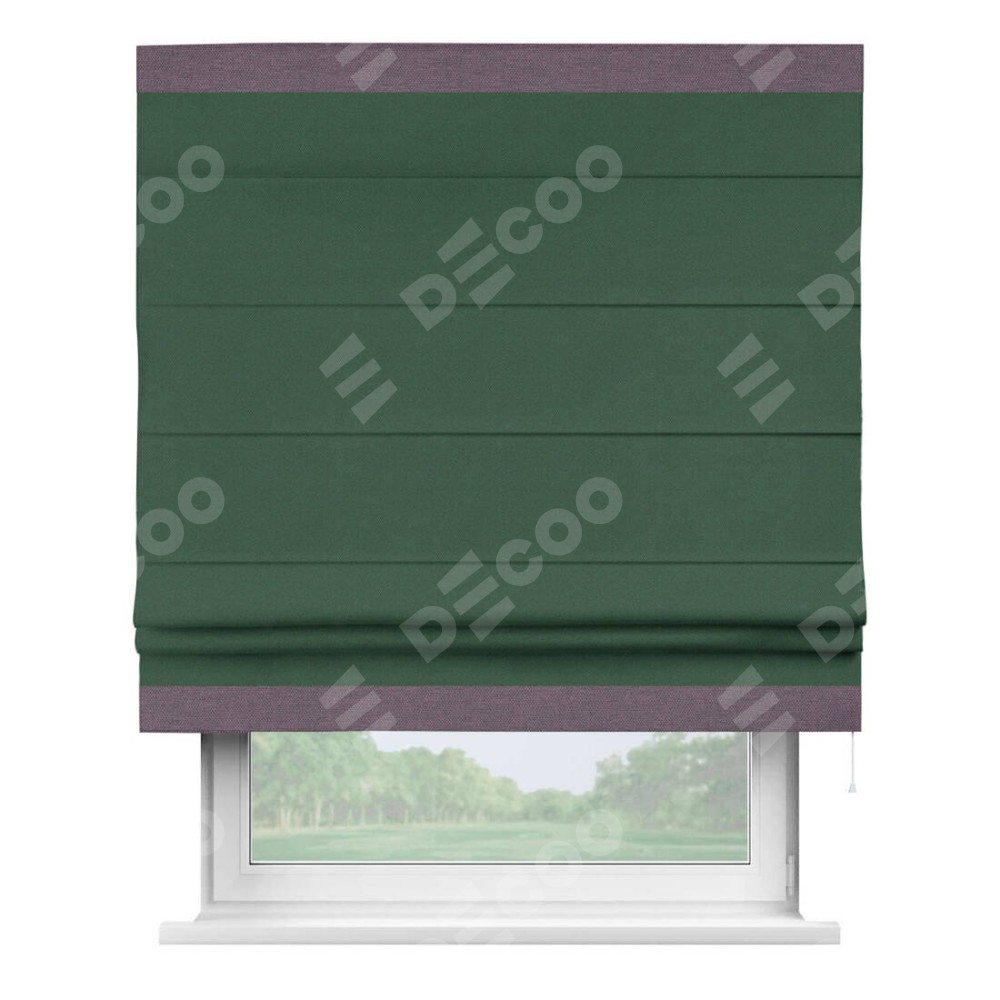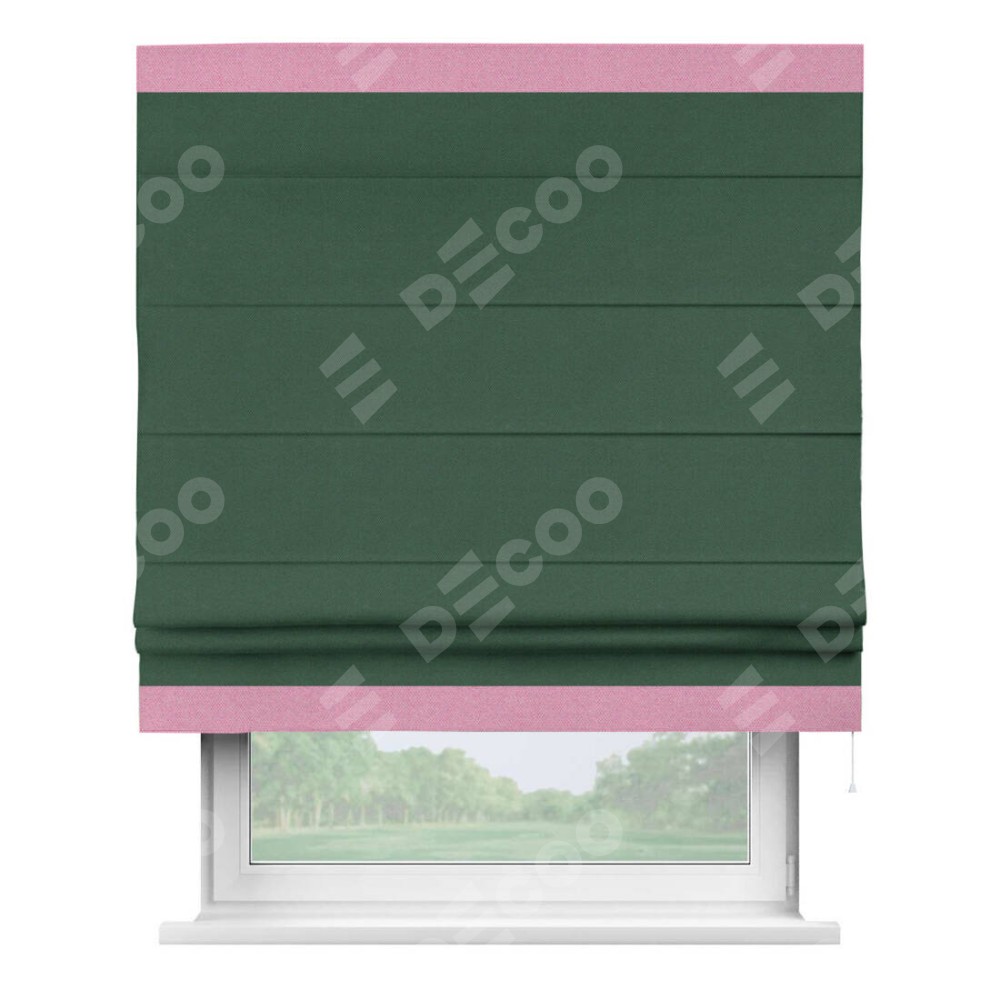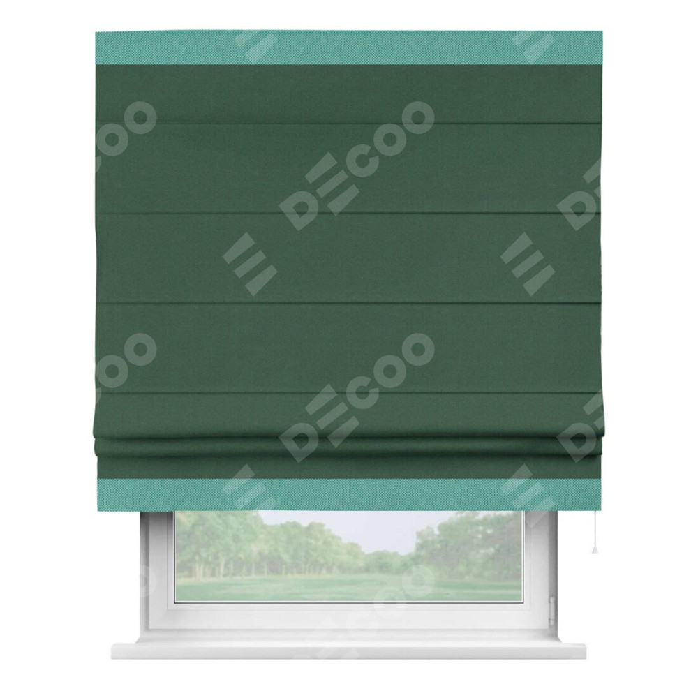 Римская штора производителя «Cortin», используется для проёма, пошита из ткани лён димаут тёмно-зелёный, артикул 16246. Отделка шторы кантом «Горизонт», ткань для канта используется из рогожки димаут разной расцветки на выбор. Имеет универсальный механизм и подходит для монтажа: на потолок, на стену и в нишу.