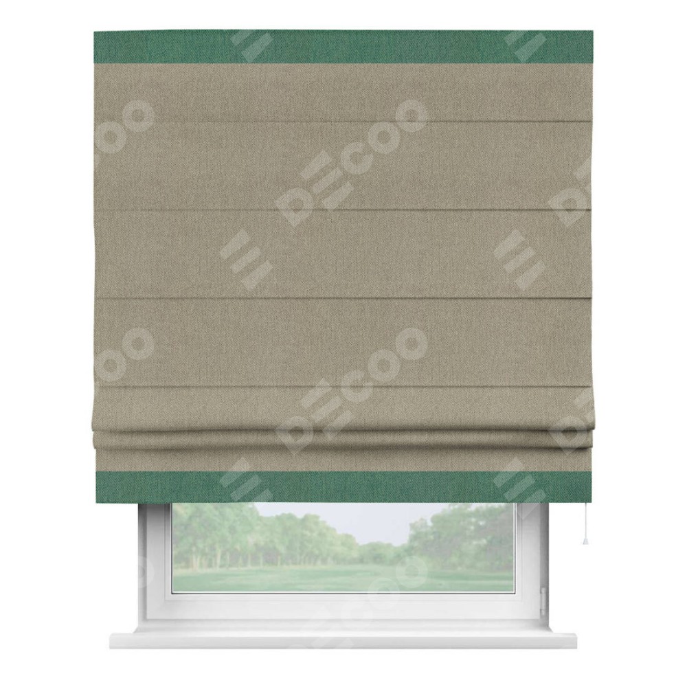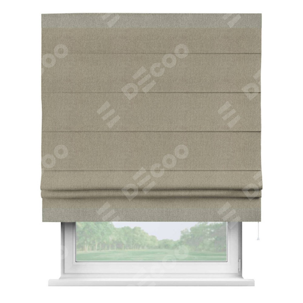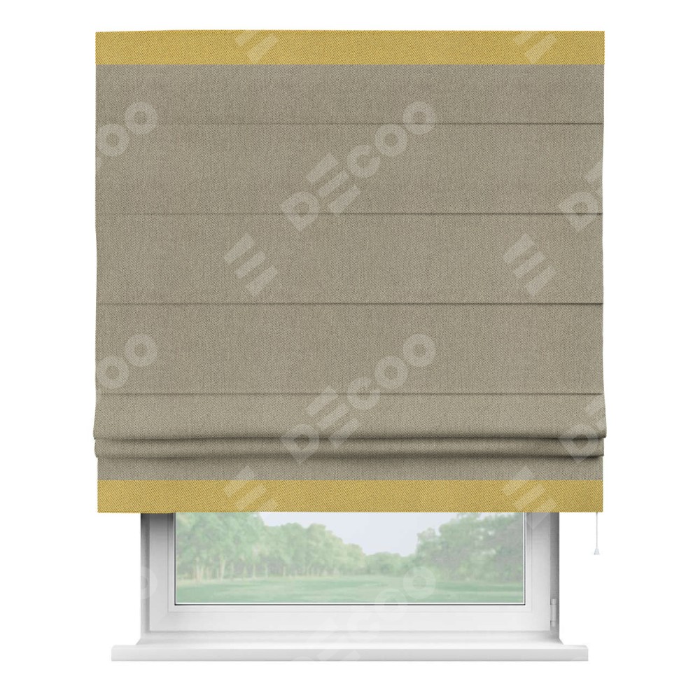 Римская штора производителя «Cortin», используется для проёма, пошита из ткани твид блэкаут кофе, артикул 21575. Отделка шторы кантом «Горизонт», ткань для канта используется из твида разной расцветки на выбор. Имеет универсальный механизм и подходит для монтажа: на потолок, на стену и в нишу.