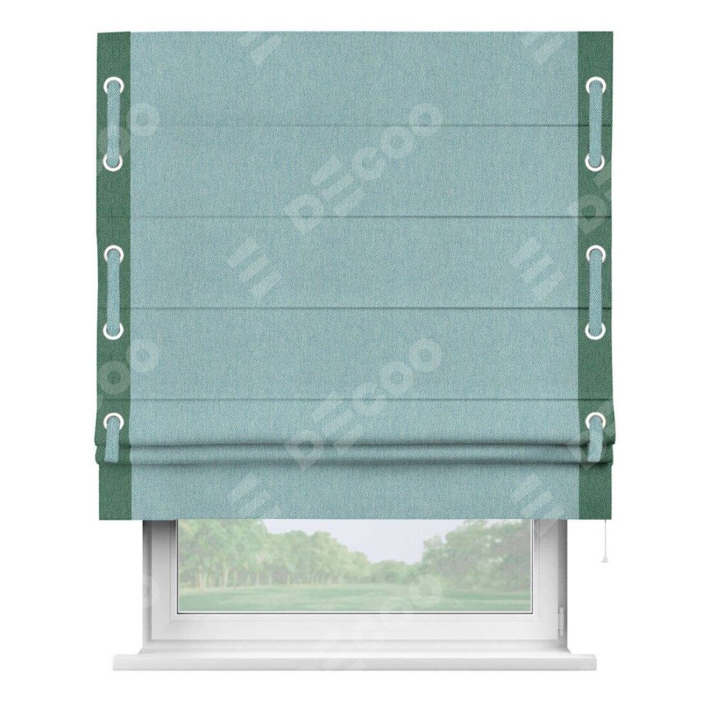 Римская штора производителя «Cortin», используется для проёма, пошита из ткани твид блэкаут небесно-голубой, артикул 21578. Отделка шторы кантом «Стрим Дуо» на кантах расположены люверсы с пояском, ткань для канта используется из твида разной расцветки на выбор. Ткань для пояска обычно используется из основной ткани шторы, а так же можно сделать из любой расцветки по желанию. Имеет универсальный механизм и подходит для монтажа: на потолок, на стену и в нишу.