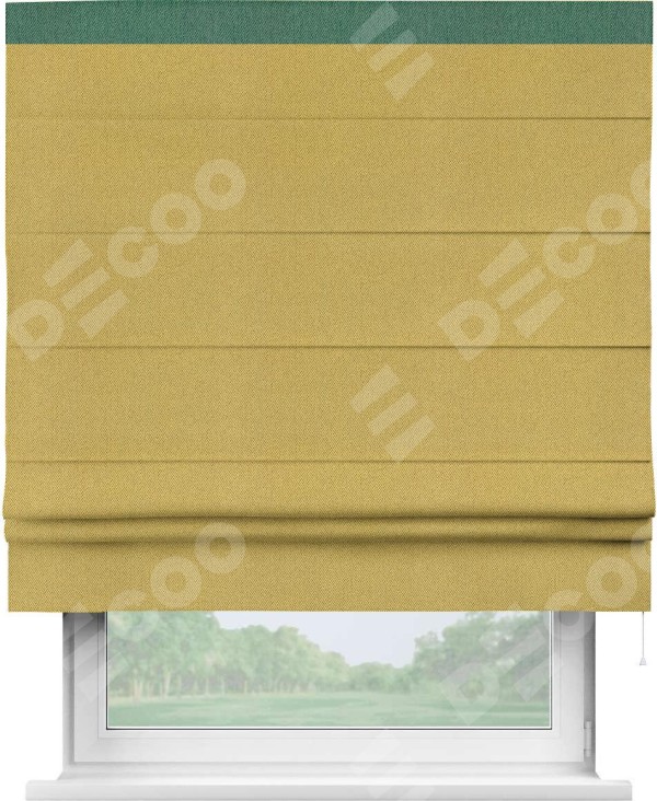 Римская штора производителя «Cortin», используется для проёма, пошита из ткани твид блэкаут пыльная горчица, артикул 21588. Отделка шторы кантом «Кинг», ткань для канта используется из твида разной расцветки на выбор. Имеет универсальный механизм и подходит для монтажа: на потолок, на стену и в нишу.