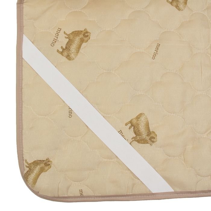 Чехол наматрасника выполнен из полиэстера светло-бежевого цвета.