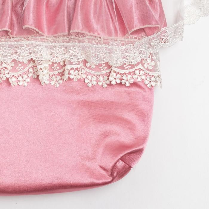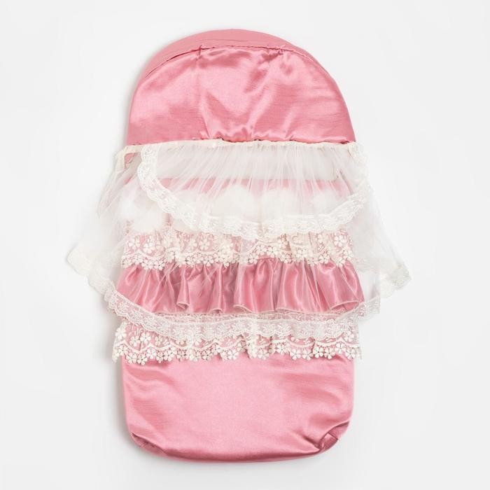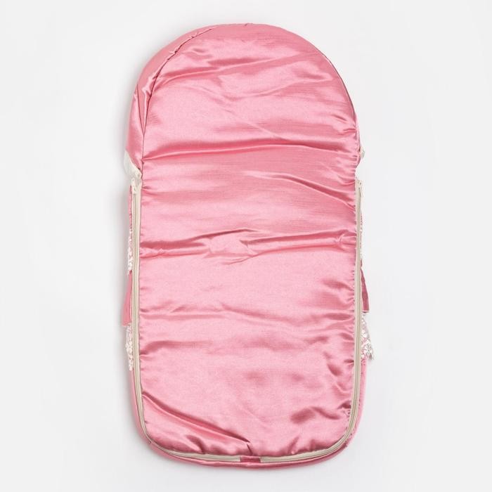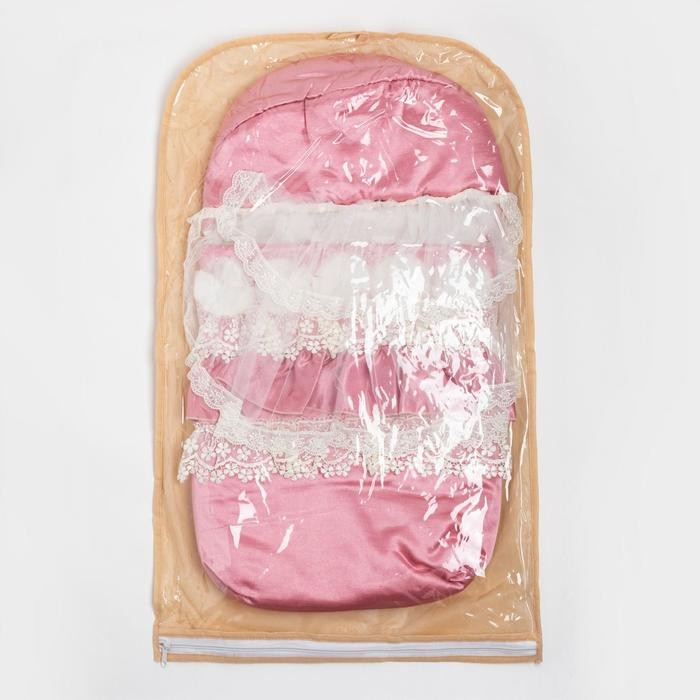 Конверт на двух боковых молниях выполнен из тонкого атласа с мягким шелковистым отливом. Есть съёмная вуаль. Подойдёт на выписку из родильного дома для прогулки.